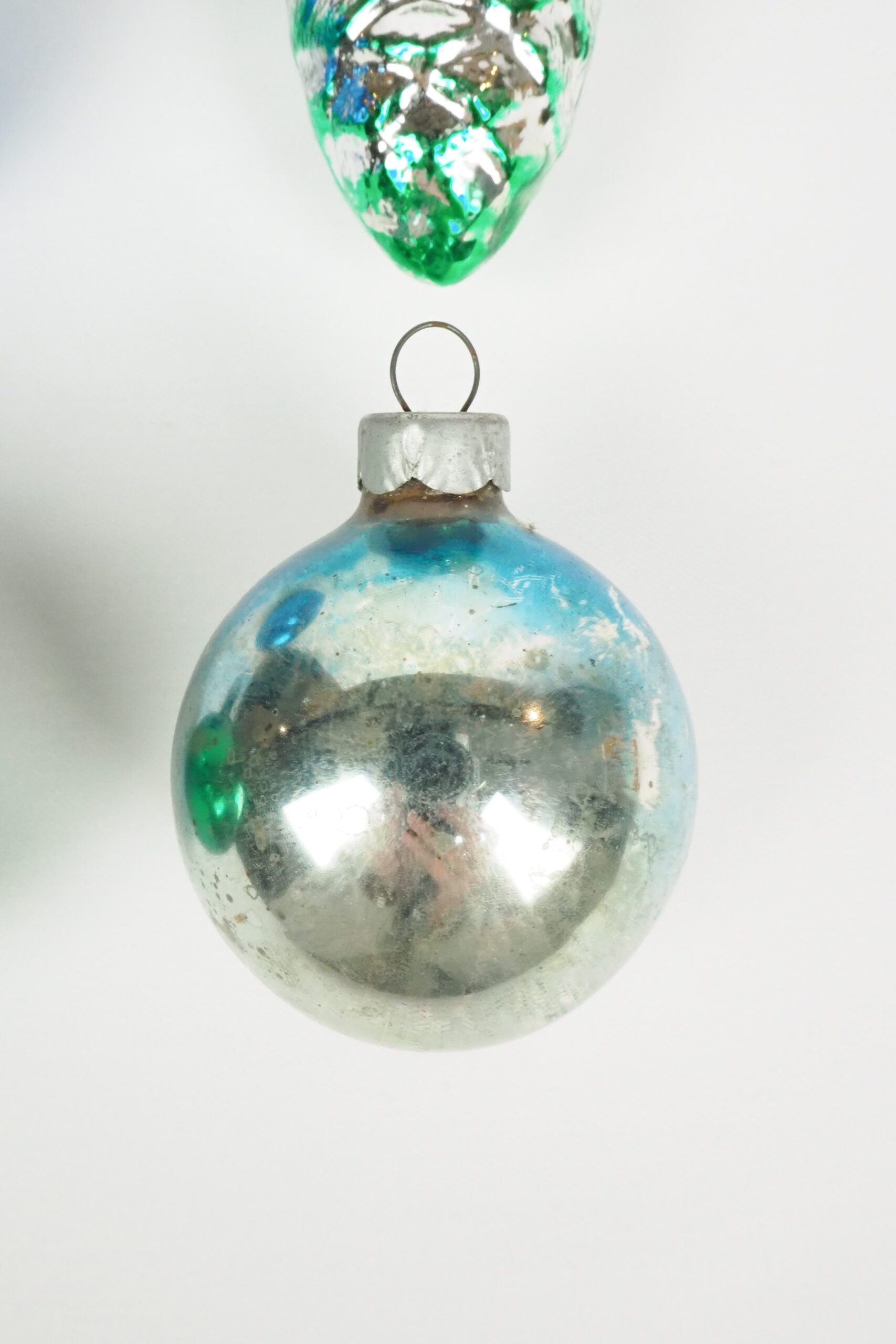 A set of 4 antique coloured glass baubles in blues and greens. This unique set of four vintage and antique coloured glass baubles has been hand selected for Wildmore to bring antique character to your space at Christmas.