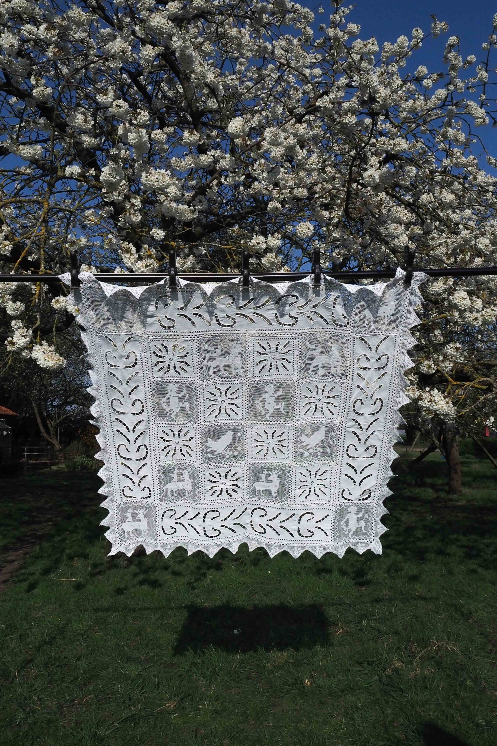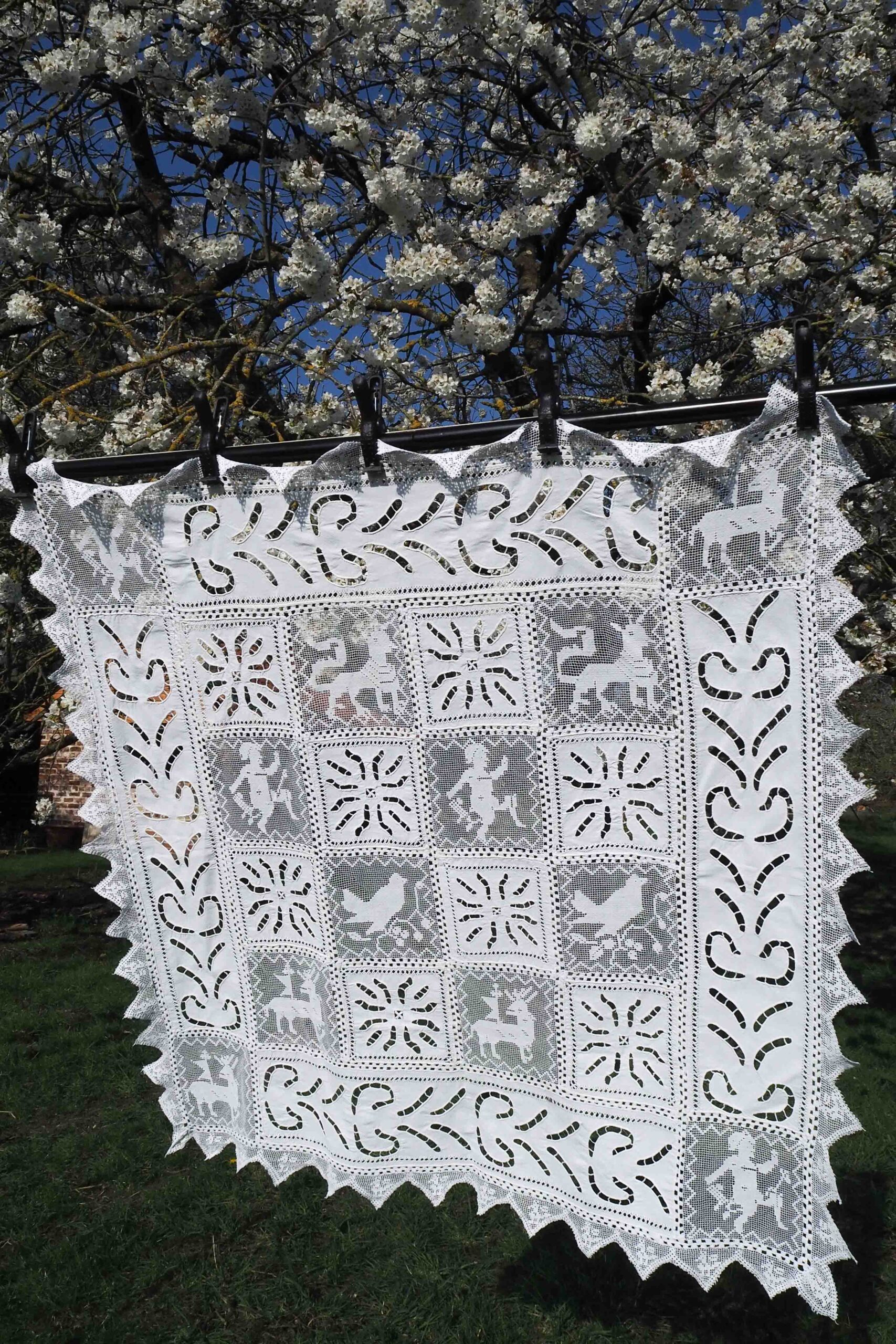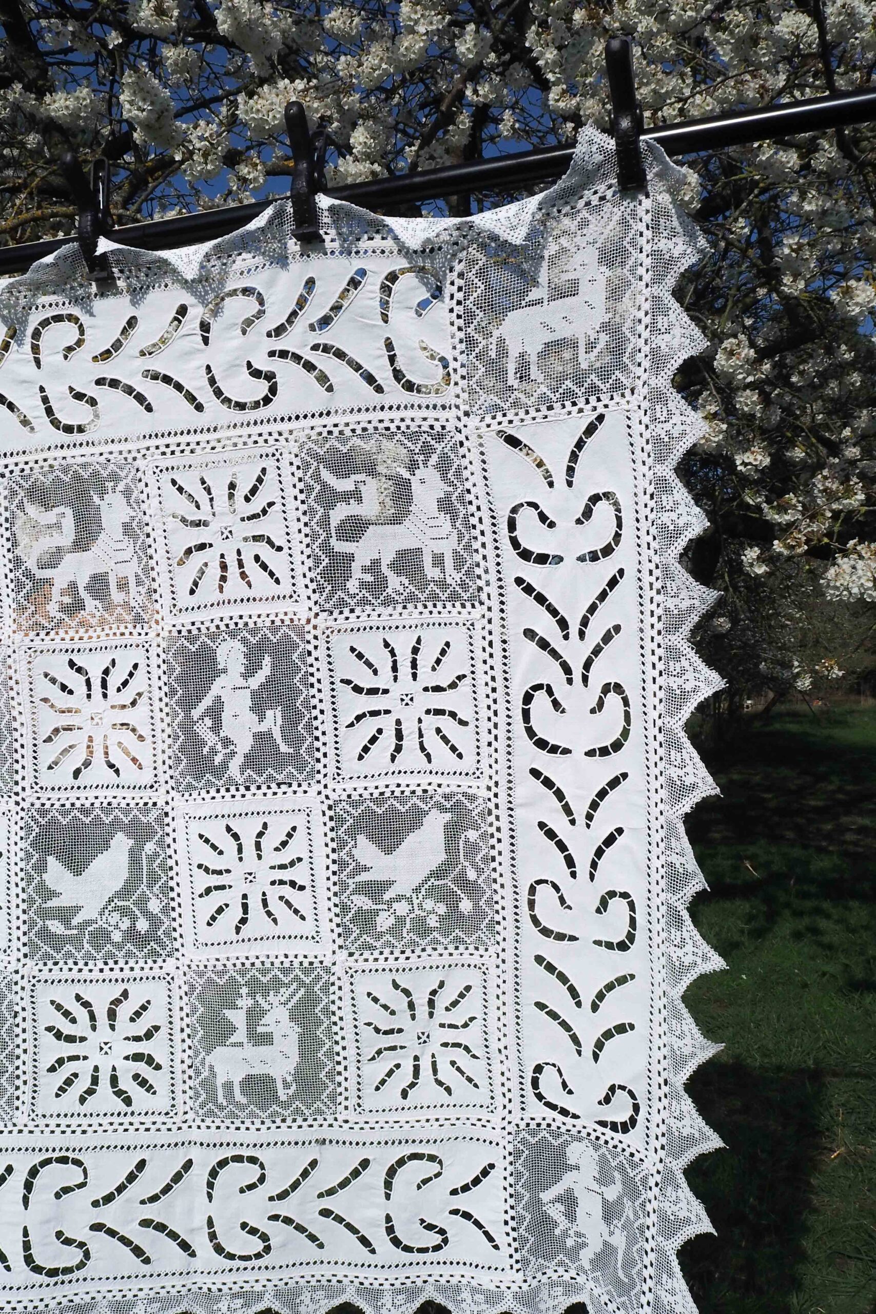 An exquisite Antique Lace and Broderie Anglaise Tablecloth woven with birds cherubs and other animals. This wonderful and rare antique white tablecloth has a stunning level of detail. Decorated with creatures inspired by 17th and 18th century animal illustrations and tiles such as those by William de Morgan. Each of our vintage and antique linens is unique, perfect for hosting a memorable diner party.