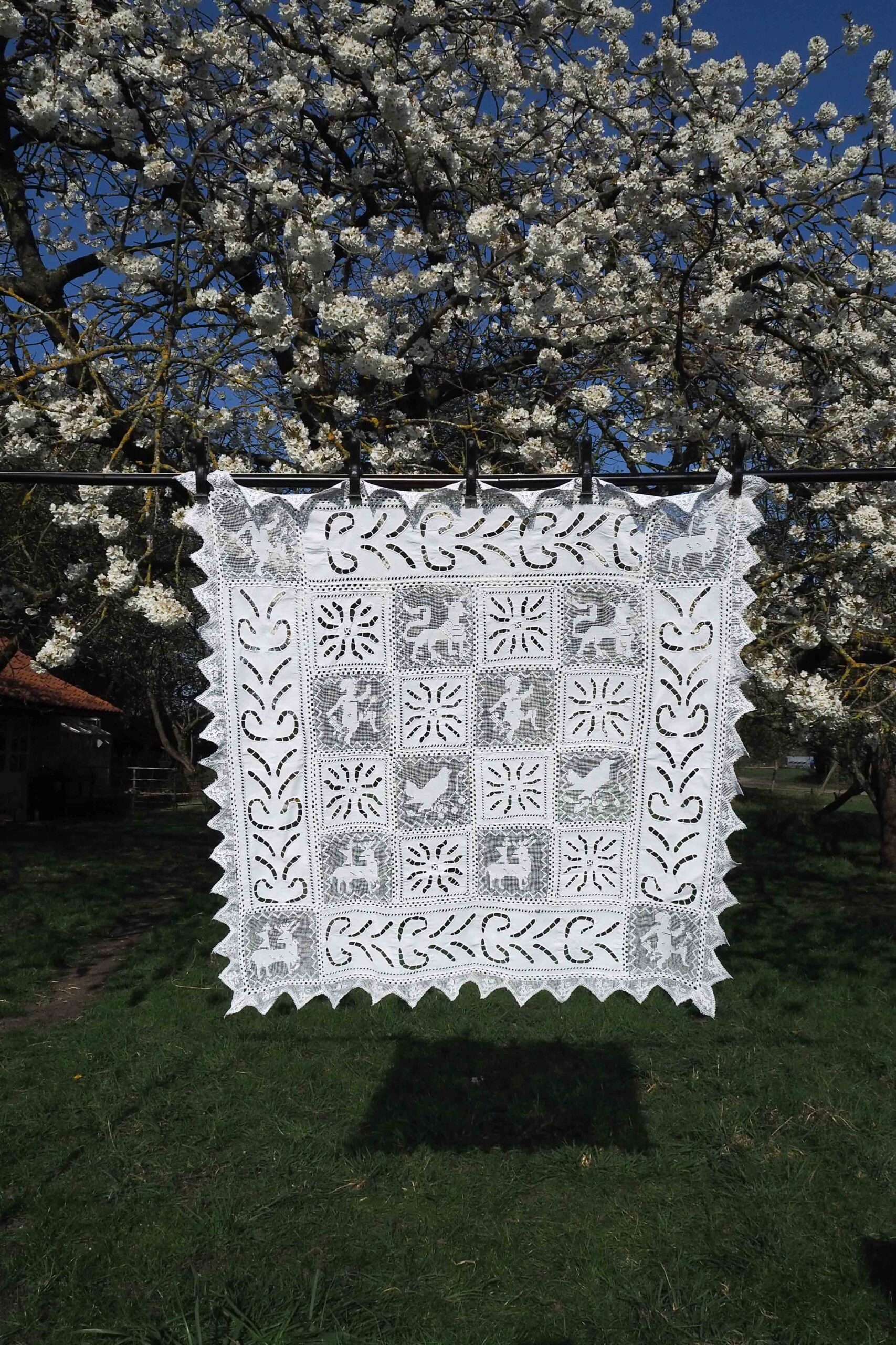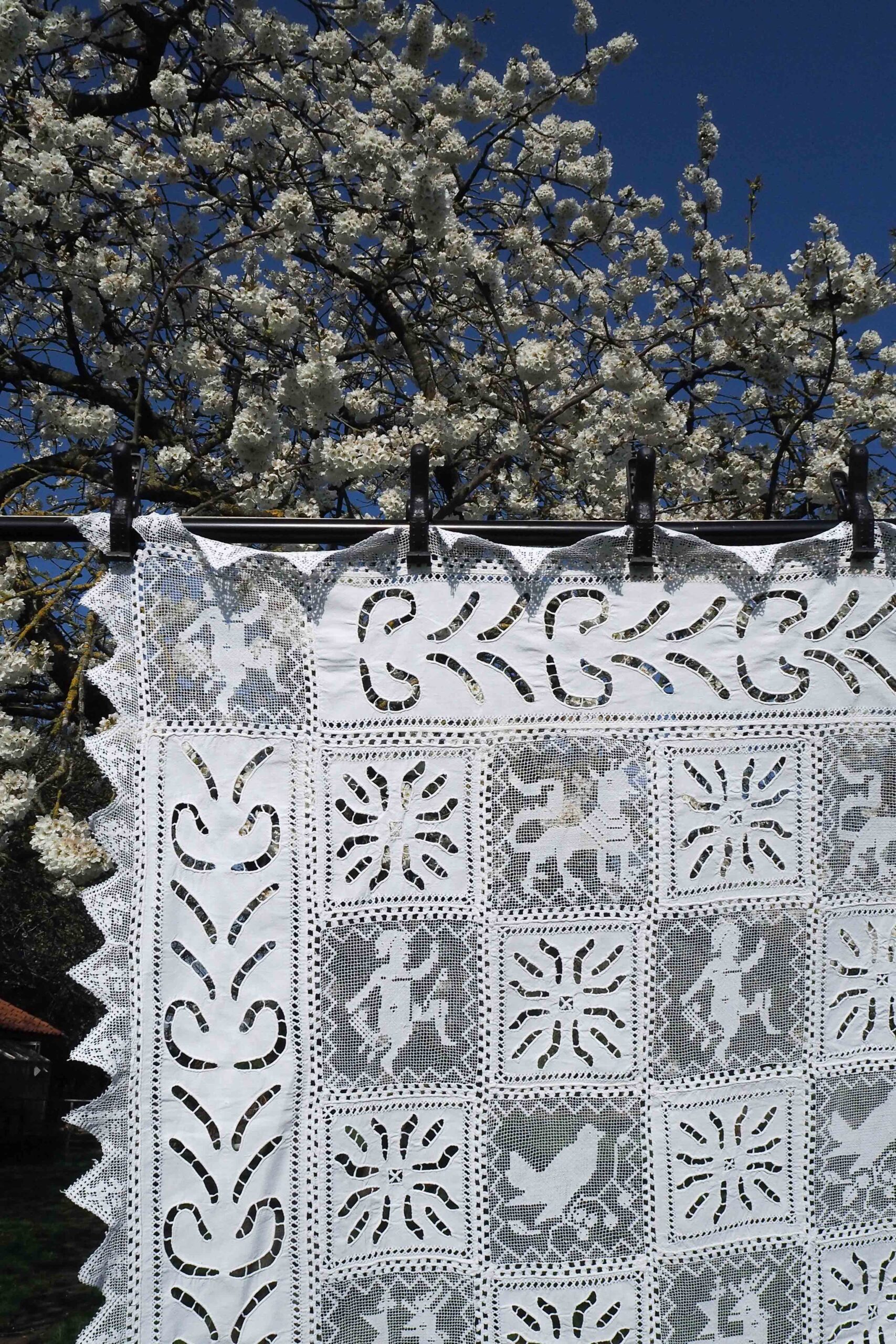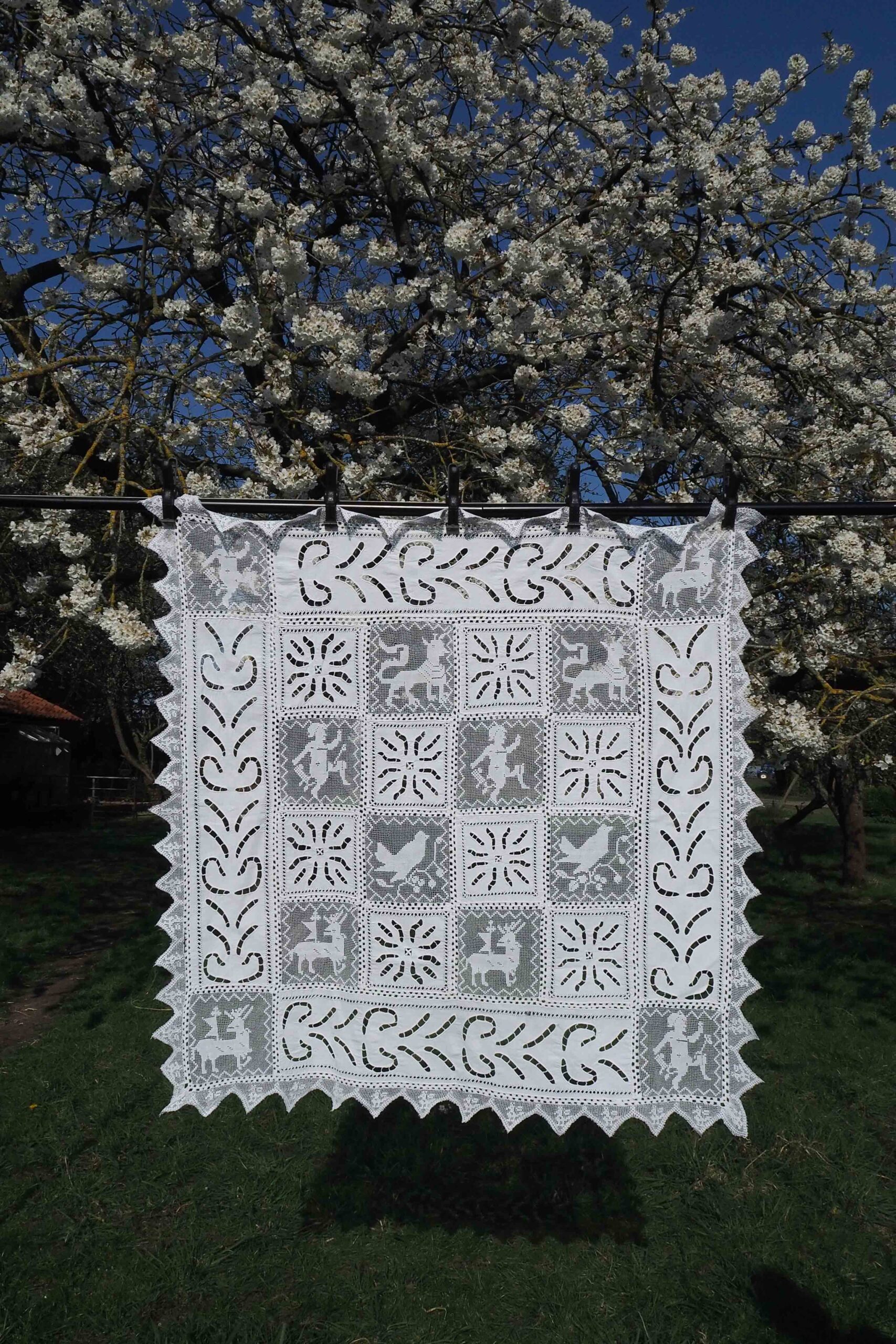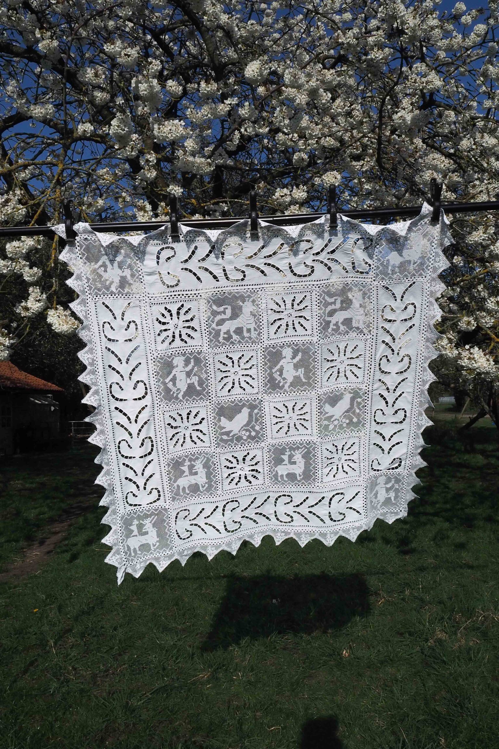 An exquisite Antique Lace and Broderie Anglaise Tablecloth woven with birds cherubs and other animals. This wonderful and rare antique white tablecloth has a stunning level of detail. Decorated with creatures inspired by 17th and 18th century animal illustrations and tiles such as those by William de Morgan. Each of our vintage and antique linens is unique, perfect for hosting a memorable diner party.