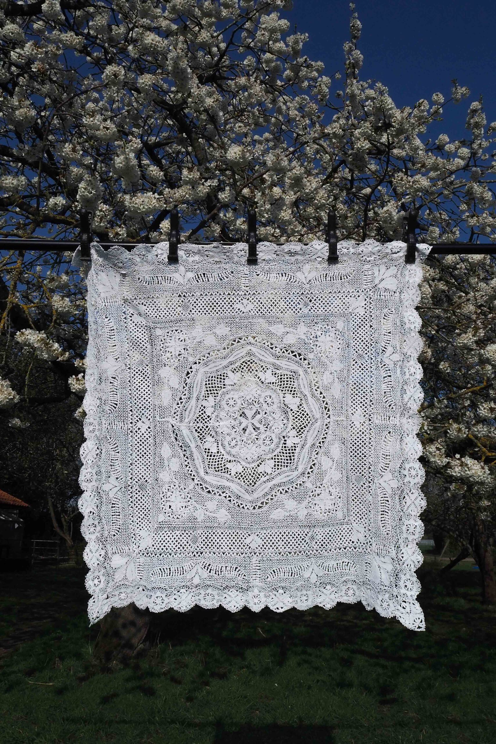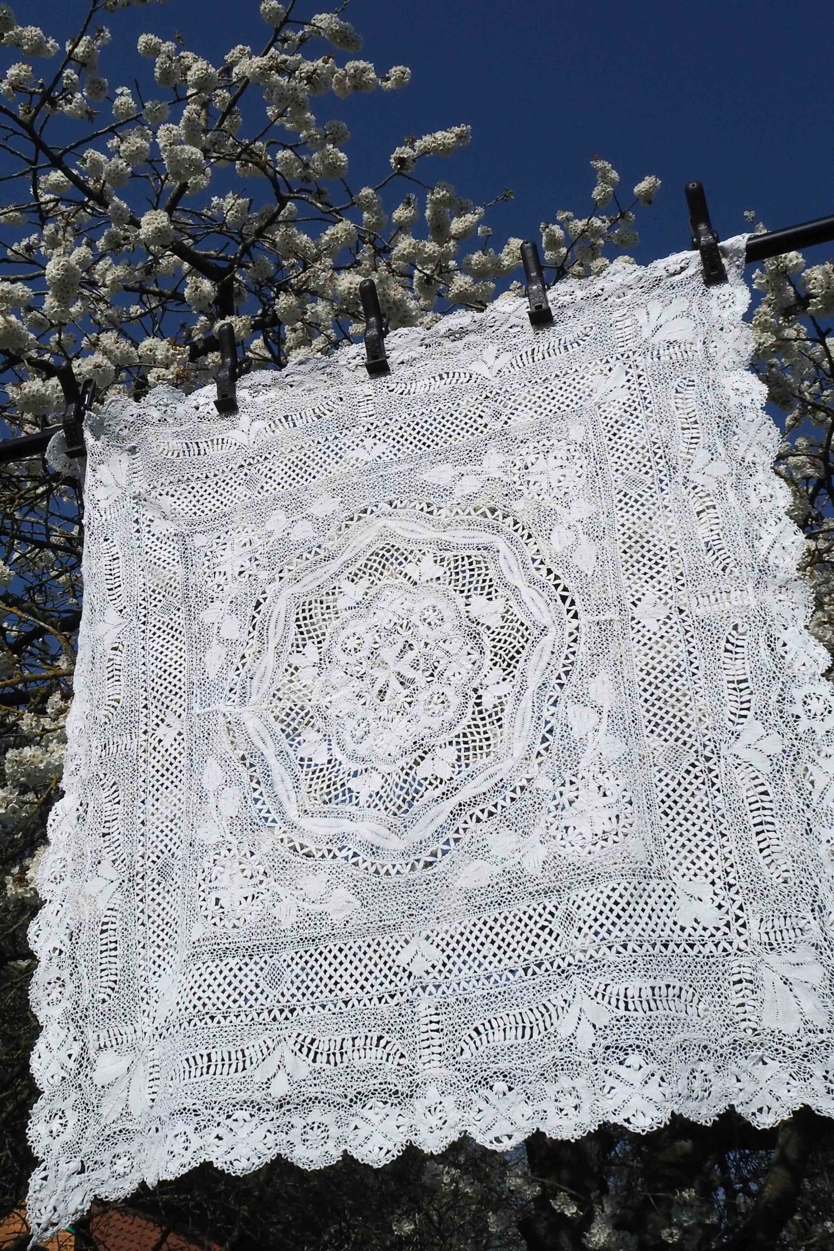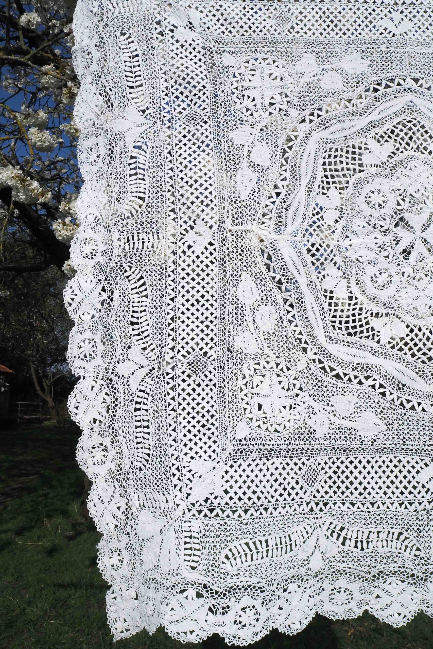 An exquisite Antique Lace Tablecloth an intricate pattern. This rare antique white tablecloth has a stunning level of detail. Each of our vintage and antique linens is unique, perfect for hosting a memorable diner party.