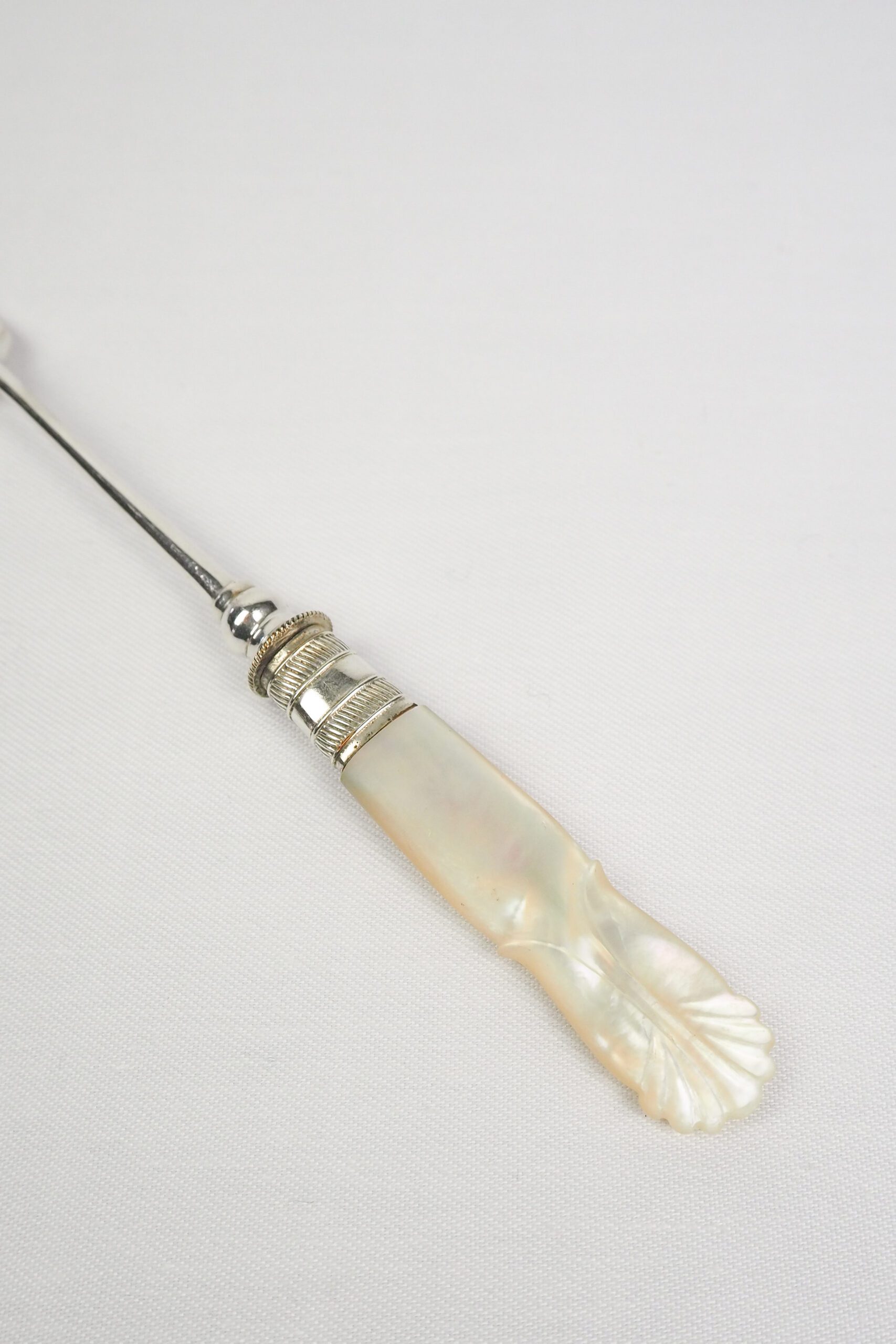 This Antique Pickle Fork is the perfect piece for your kitchen. With an ornate carved Mother of Pearl handle and a Silver Plated neck and barbed prongs it is an incredibly useful and beautiful piece of cutlery. Perfectly designed for spearing pickled onions, olives or gherkins. Circa early 1900s.