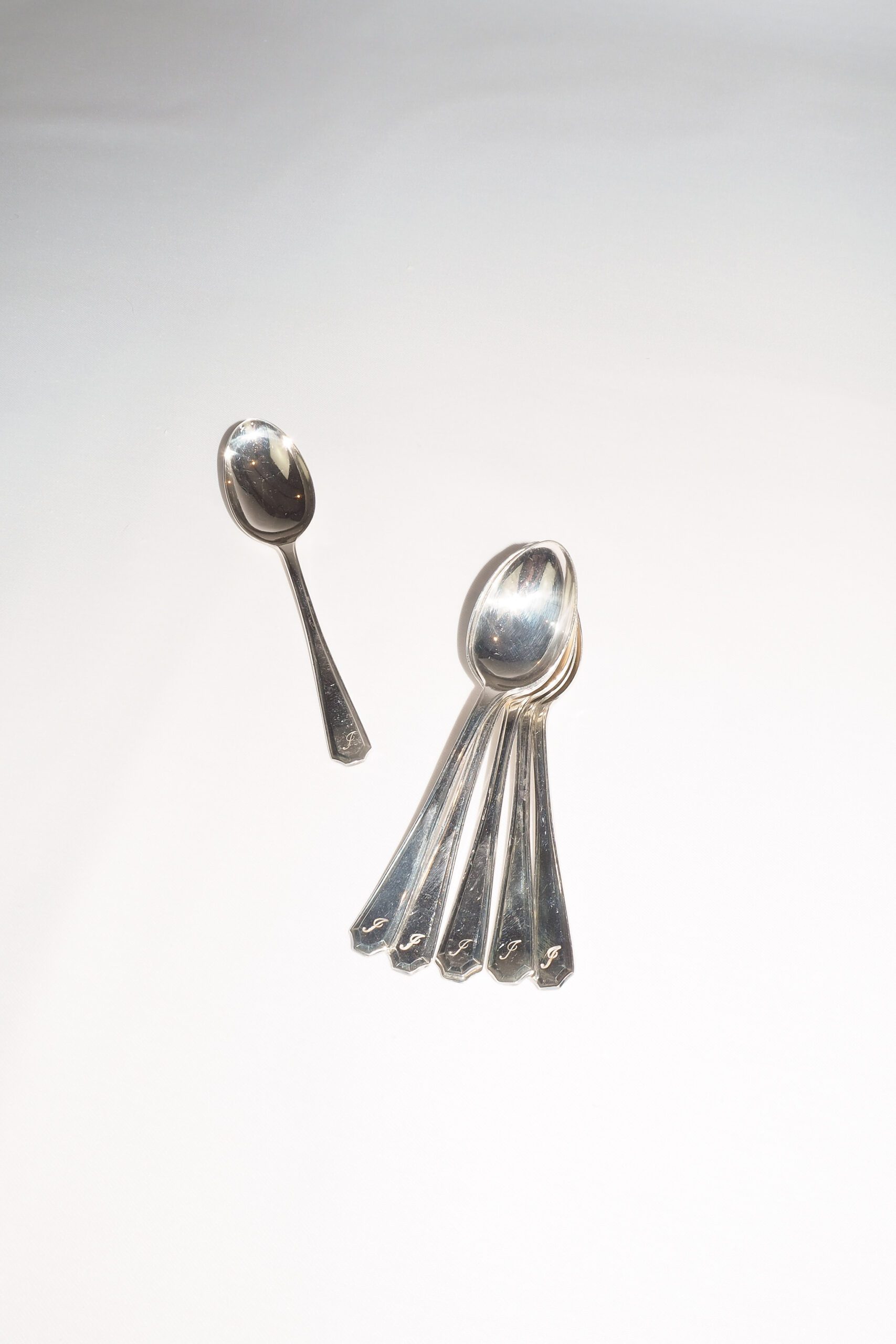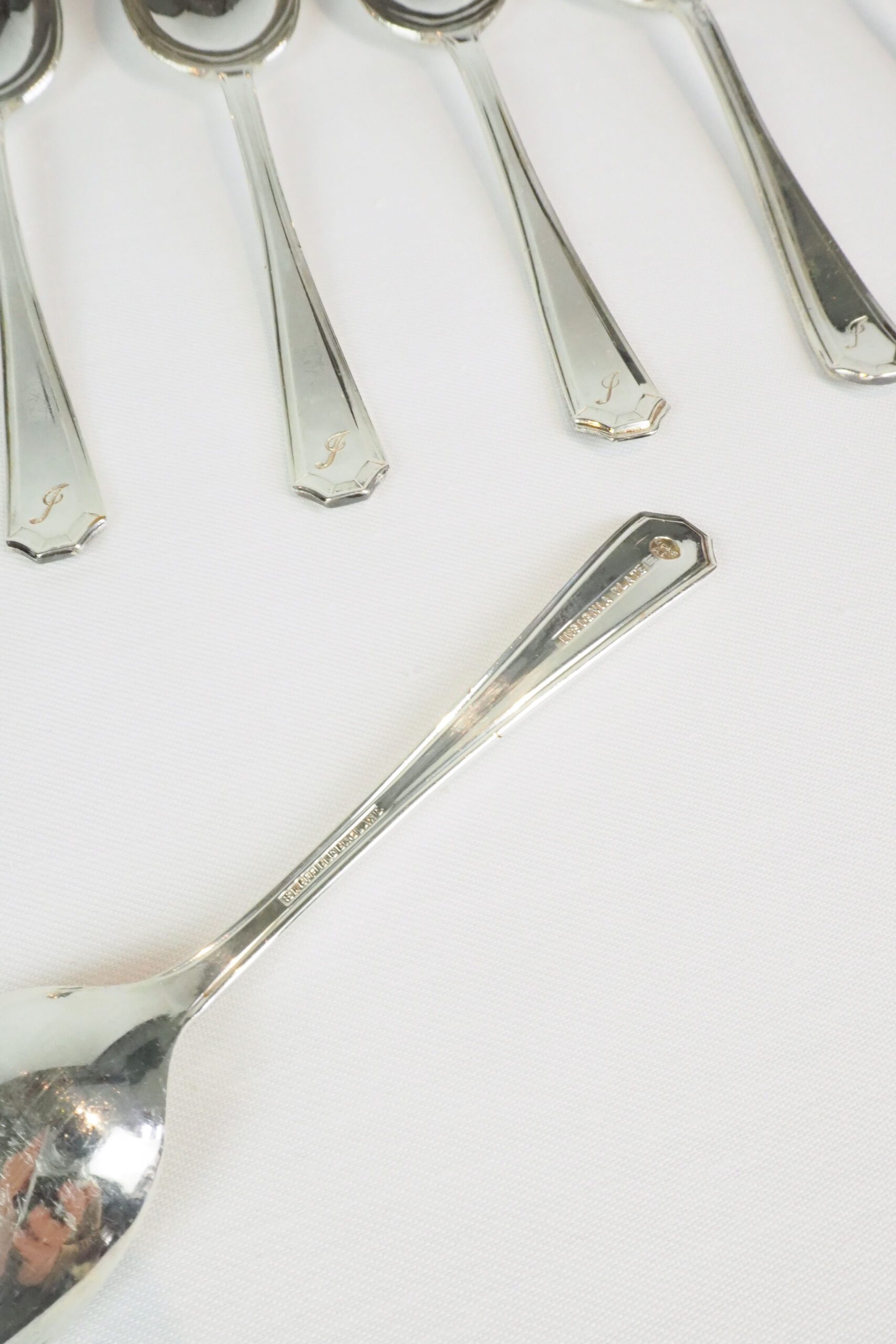 This set of 6 Vintage Silver Plate Teaspoons are monogrammed J. The stylish handles give a classic look to these antique teaspoons.