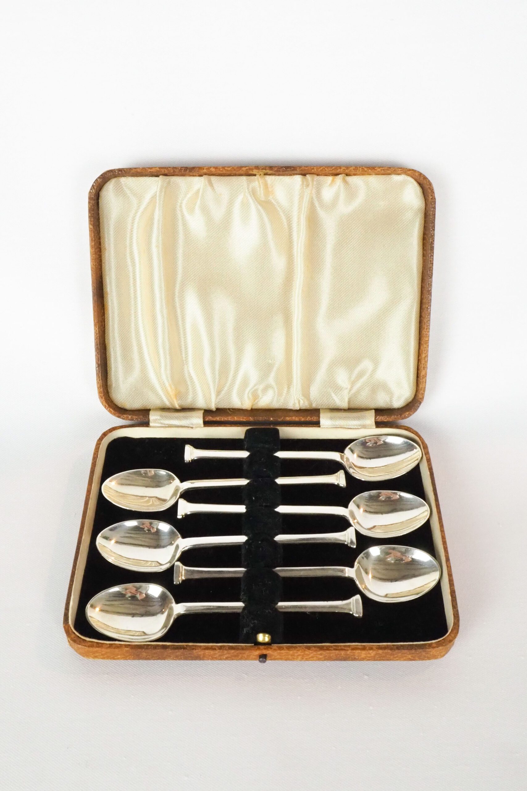 This set of 6 Vintage Silver Plate Teaspoons come in their original box. The wonderful art deco style handles give a contemporary look to these antique teaspoons.