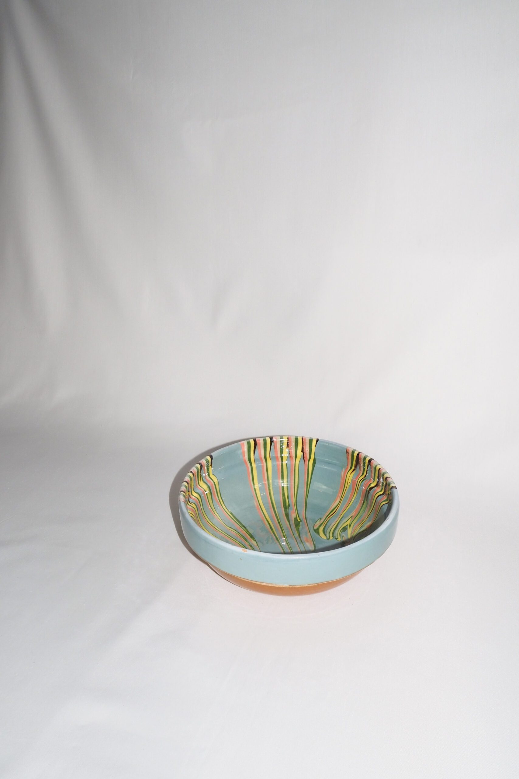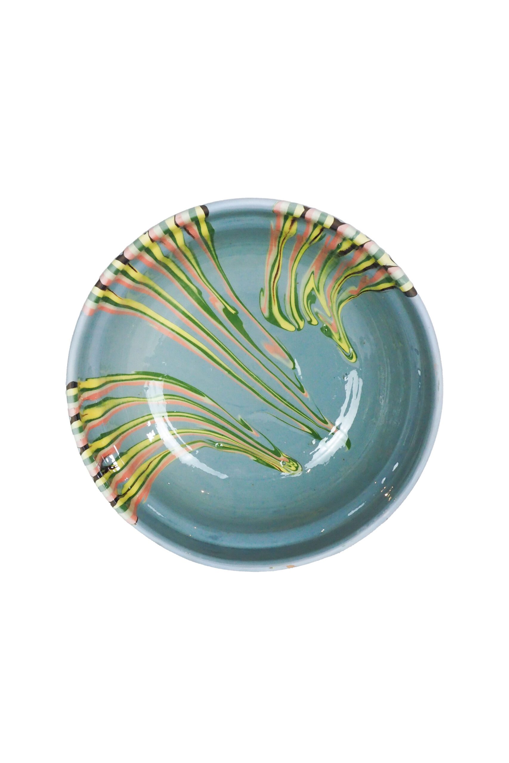 Colours and patterns will vary between each piece so please expect your bowl to be beautifully unique. Each marble pattern bowl may have a few bumps and scrapes from the hand made process but it all adds to the character. These hand made slipware bowls are pieces of folk art have swirls of pink, off white, lemon yellow, green and brown running through the glaze. Price per bowl.