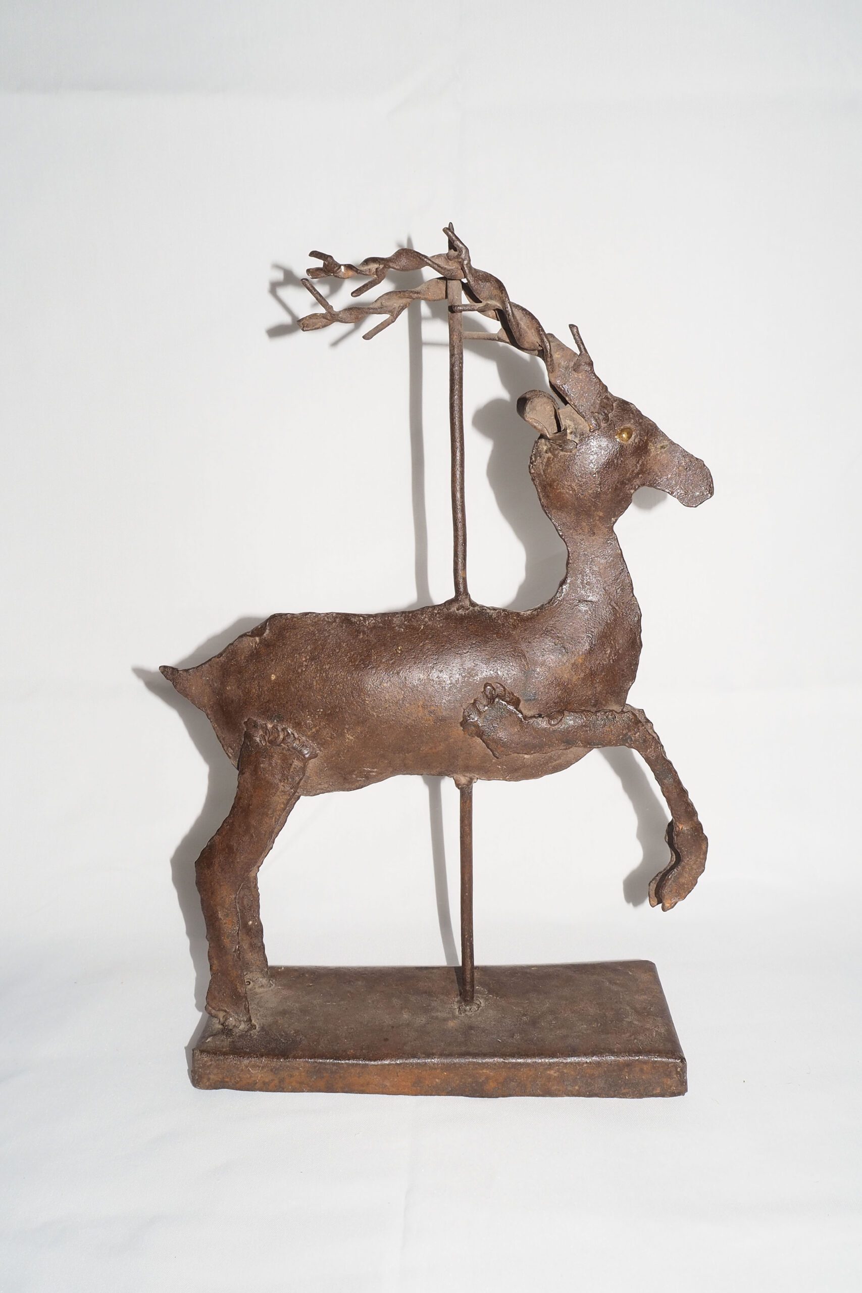 A Folk Art Reindeer. This characterful hand crafted deer is a wonderful piece to decorate your space this Christmas. This piece has been hand crafted from reclaimed metal. Perfect for your mantelpiece or perched on your sideboard. A candle can be stuck in the spire at the top to allow wax to cascade down the antlers.