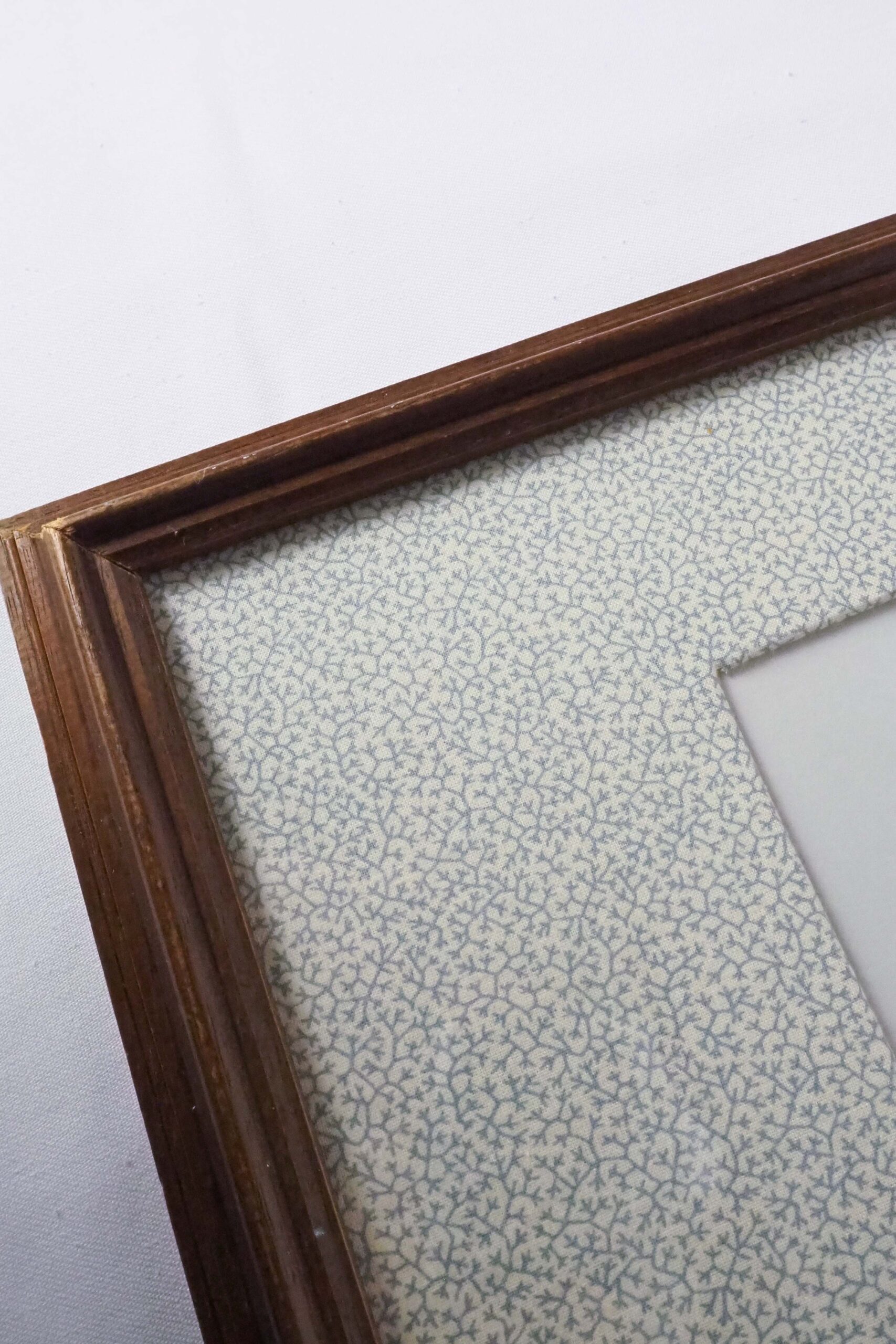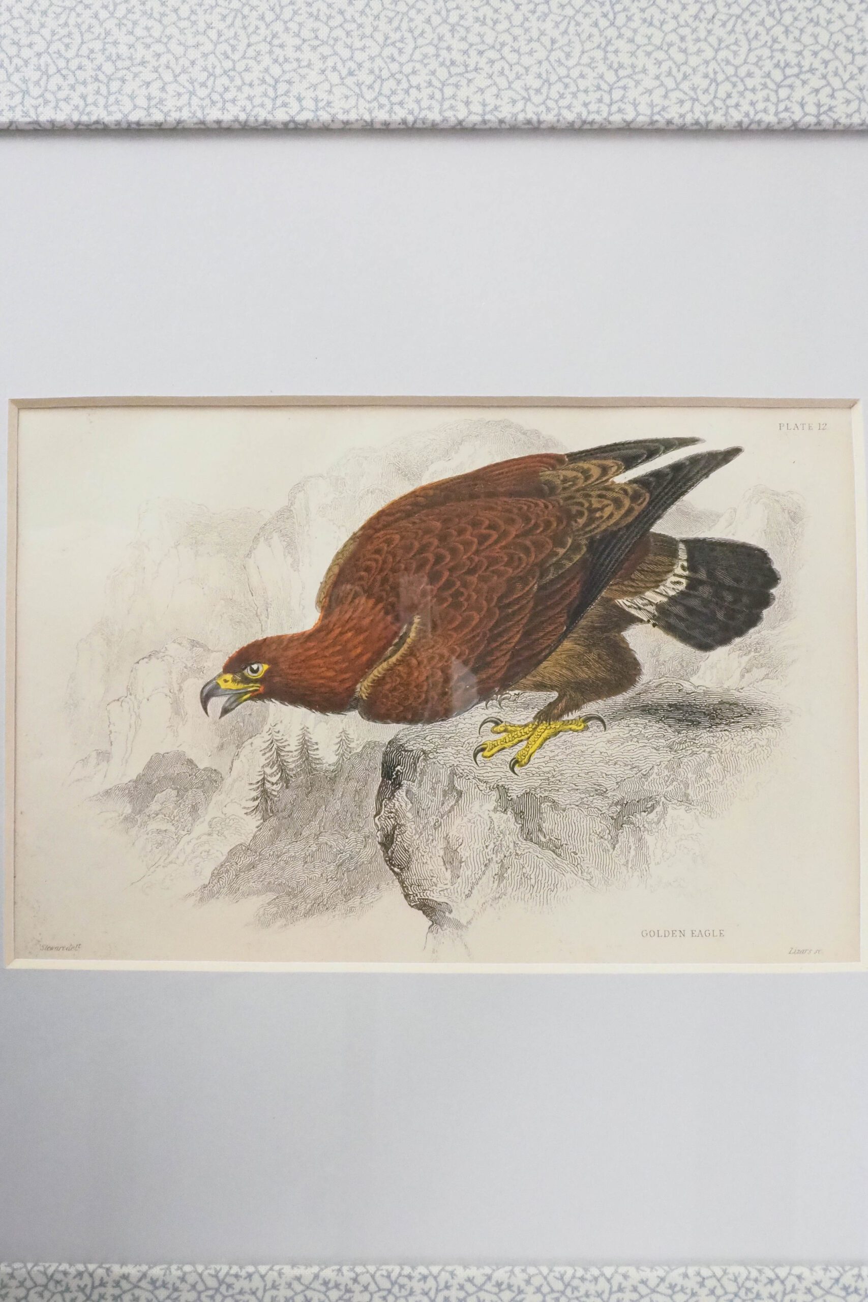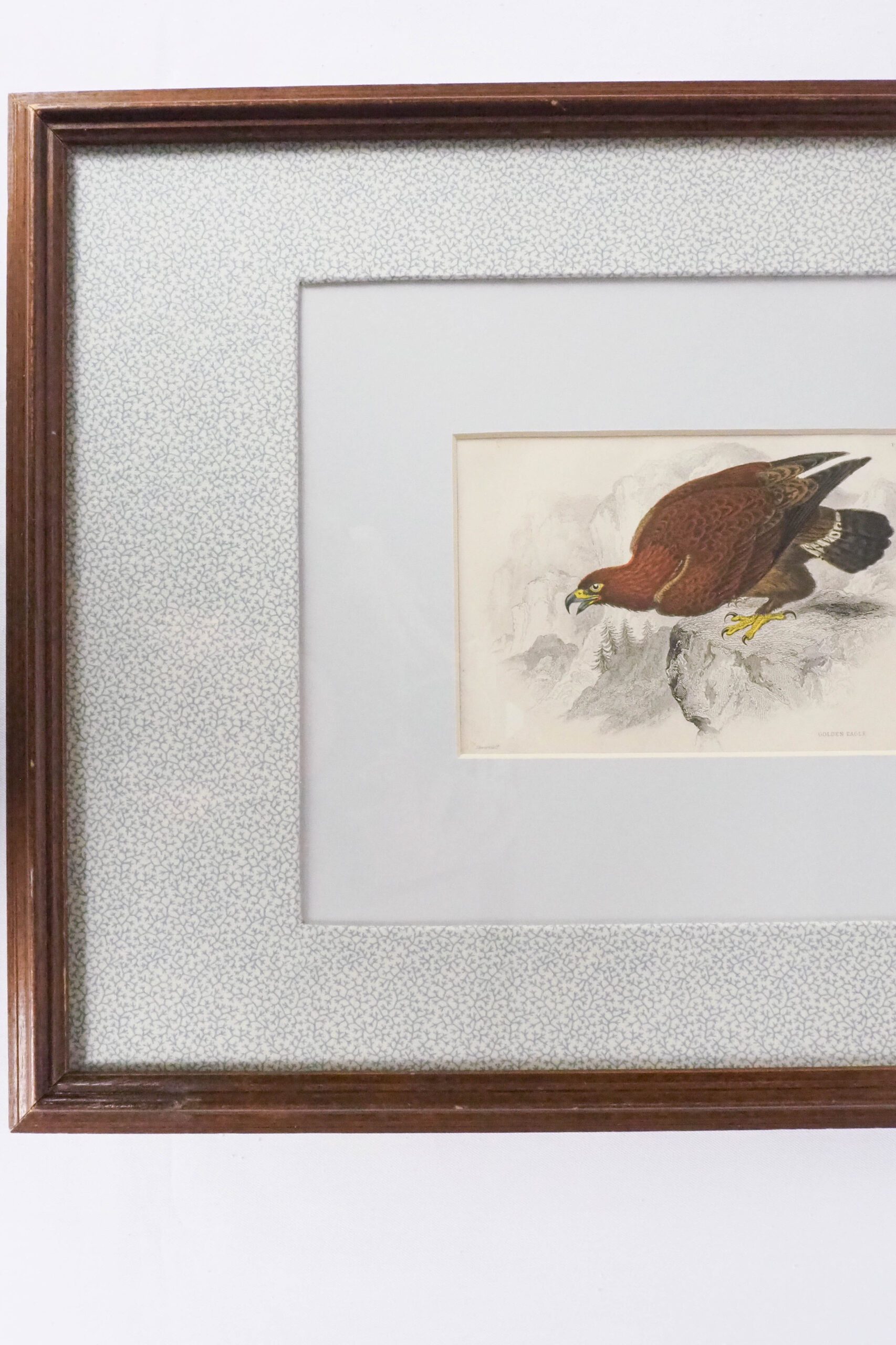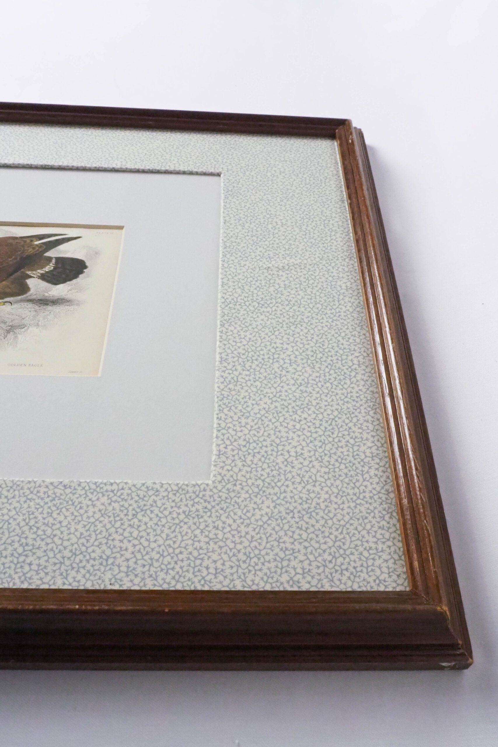 This stunning original Framed Antique Eagle Print has been framed in a vintage wooden frame. Sea-foam coloured inner mount and blue and cream pattern cotton fabric mount. The 19th century print of an Eagle is hand coloured in watercolour.