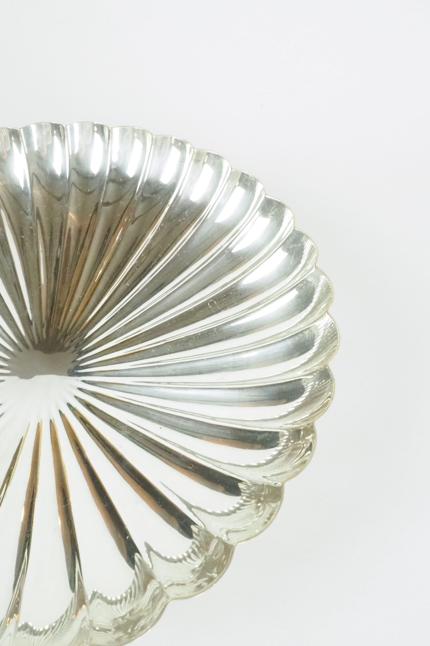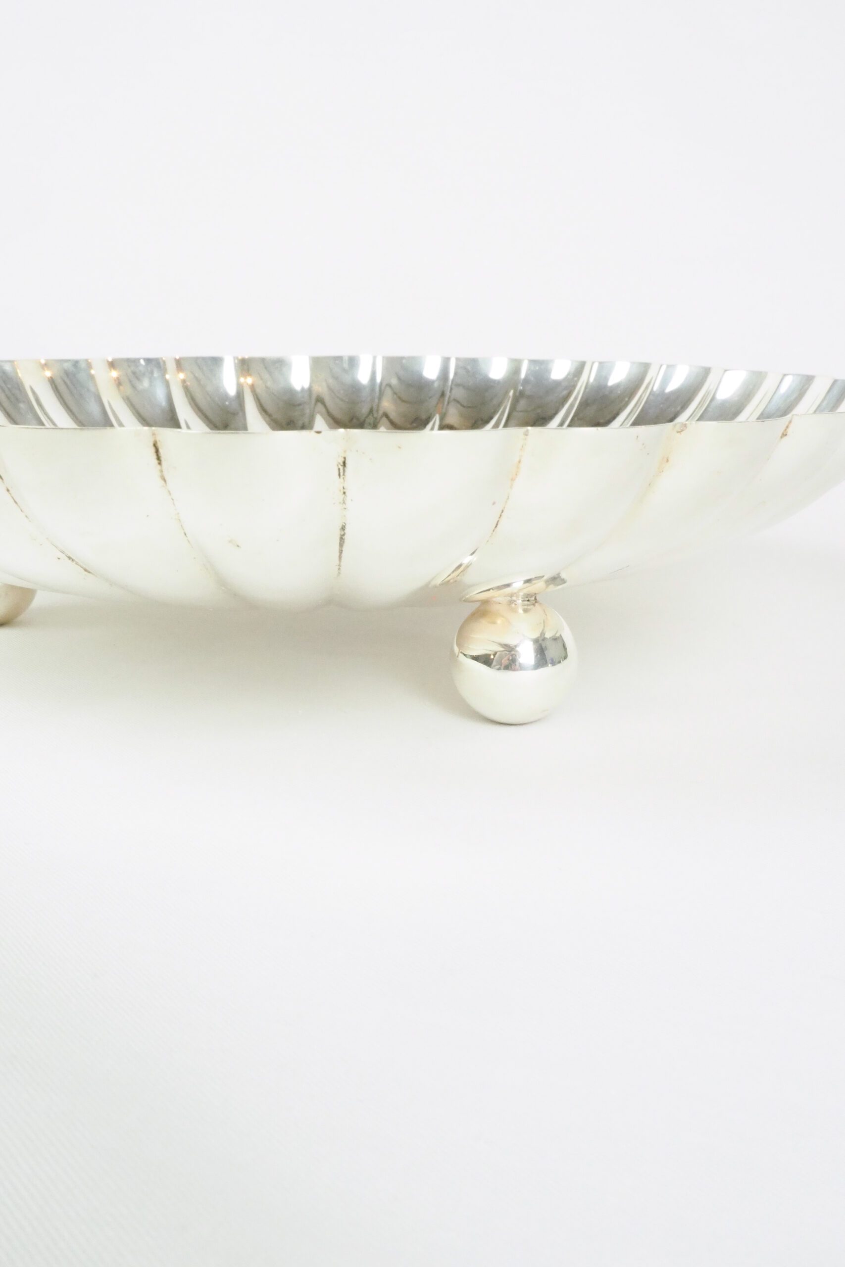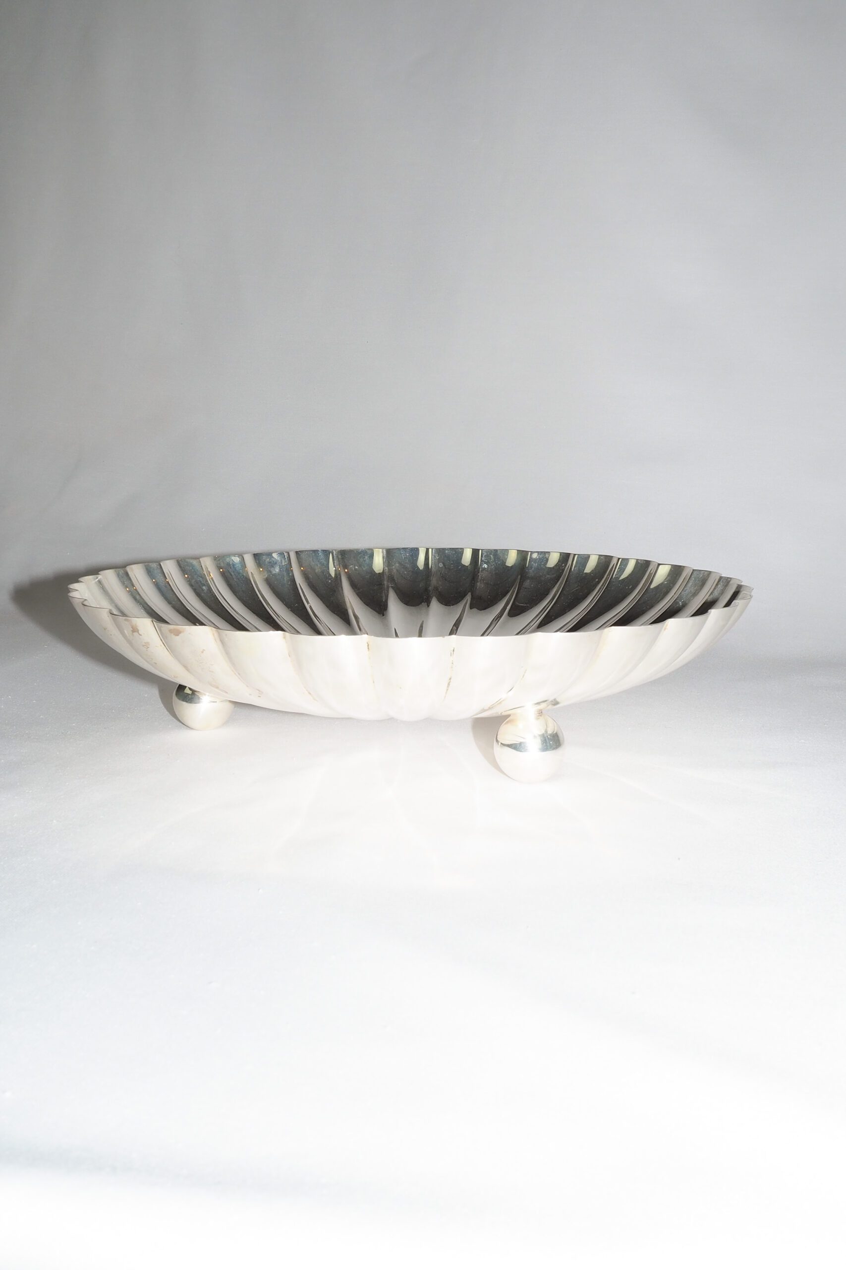 This stylish Large Antique Silver Plate Dish is the perfect centrepiece to fill with fruit. The wonderful round bun feet, scalloped edge and fluting give this English silver plate bowl a timeless look.
