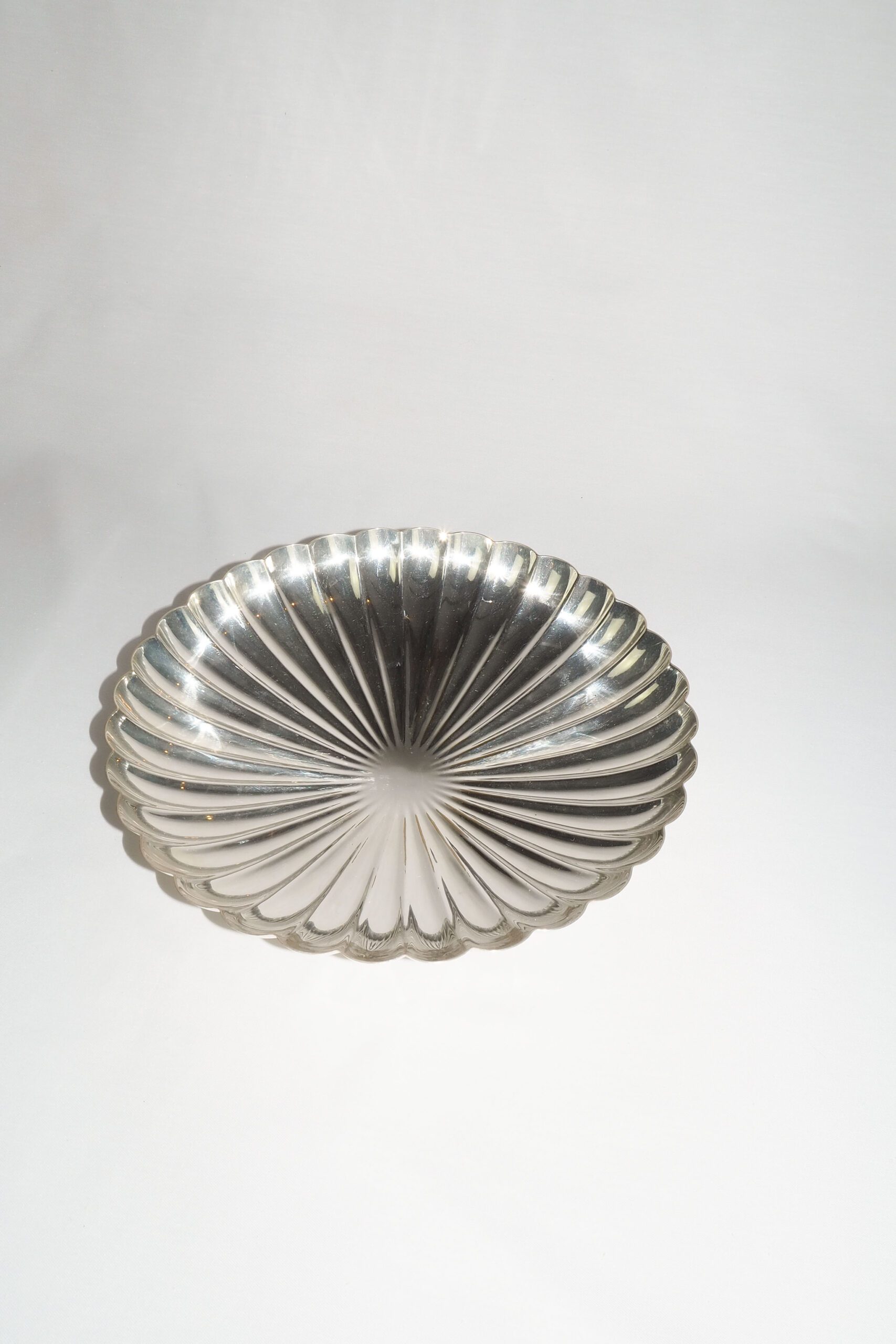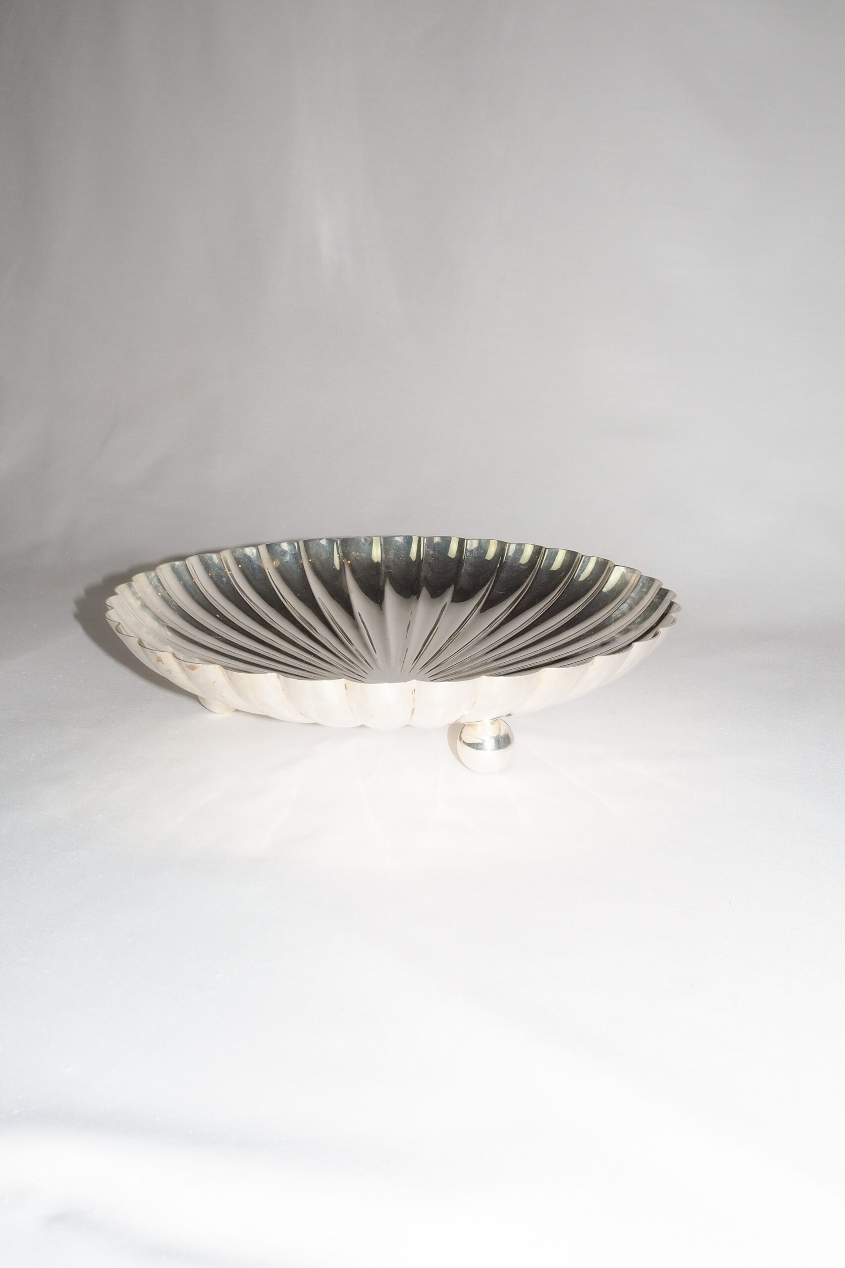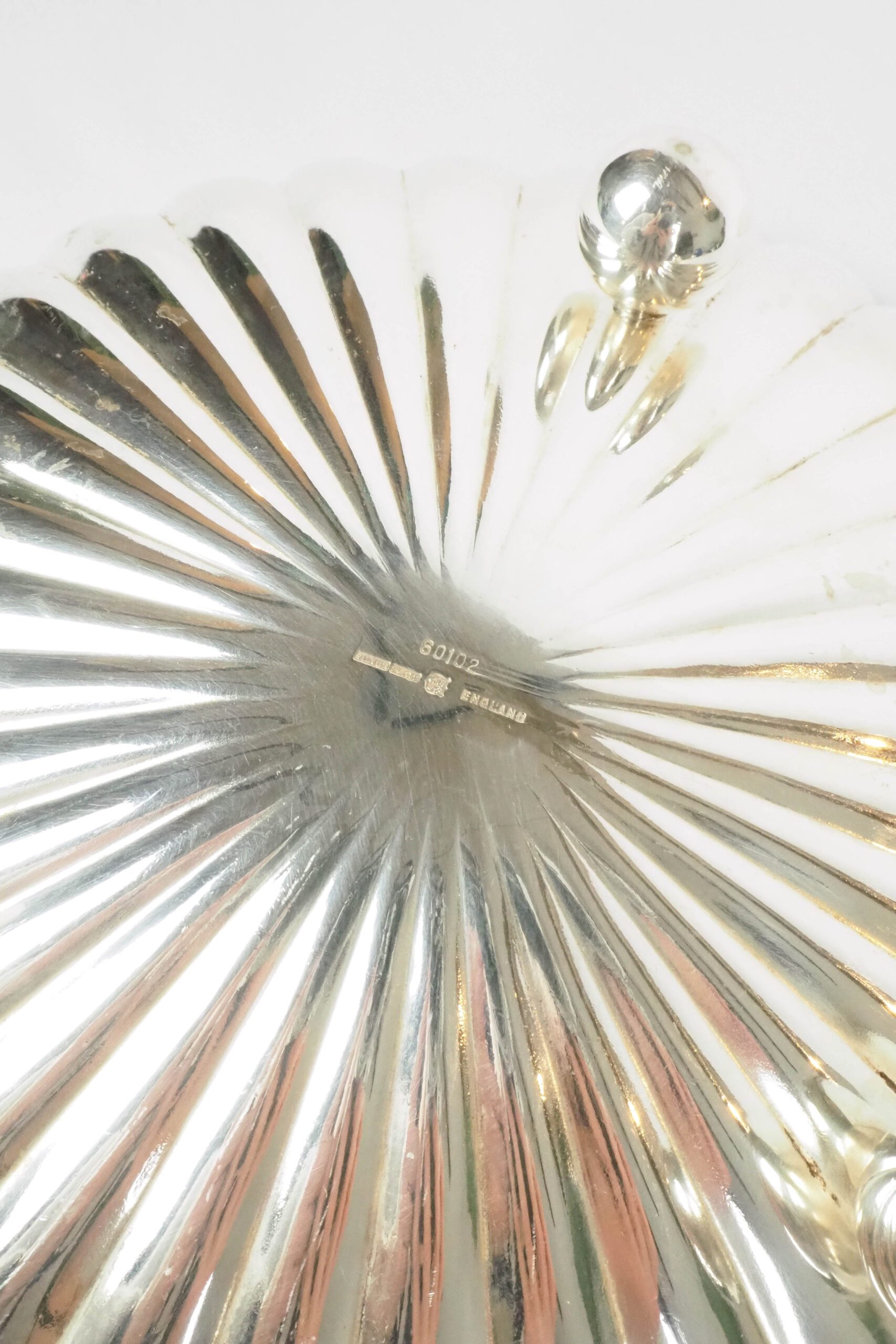 This stylish Large Antique Silver Plate Dish is the perfect centrepiece to fill with fruit. The wonderful round bun feet, scalloped edge and fluting give this English silver plate bowl a timeless look.