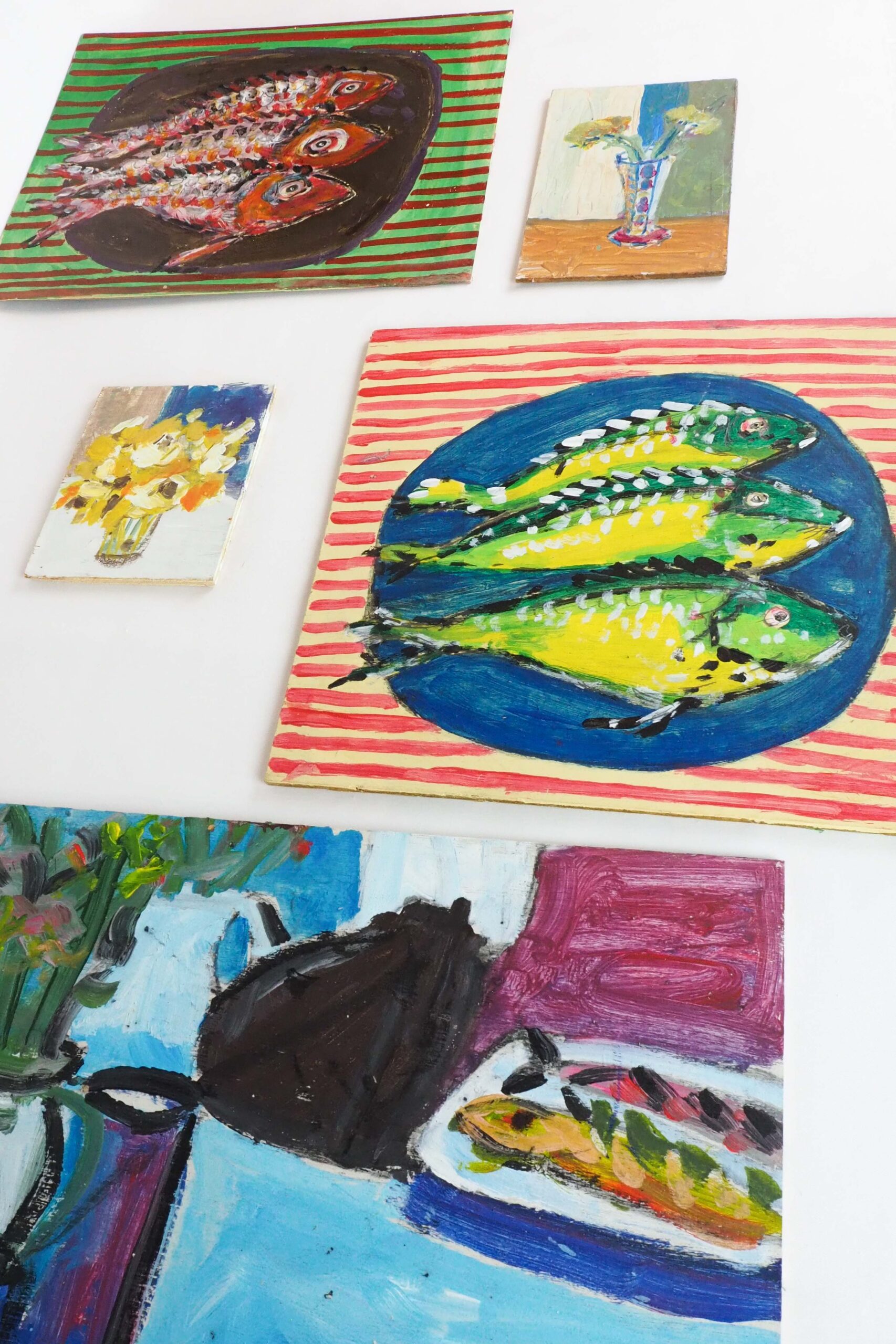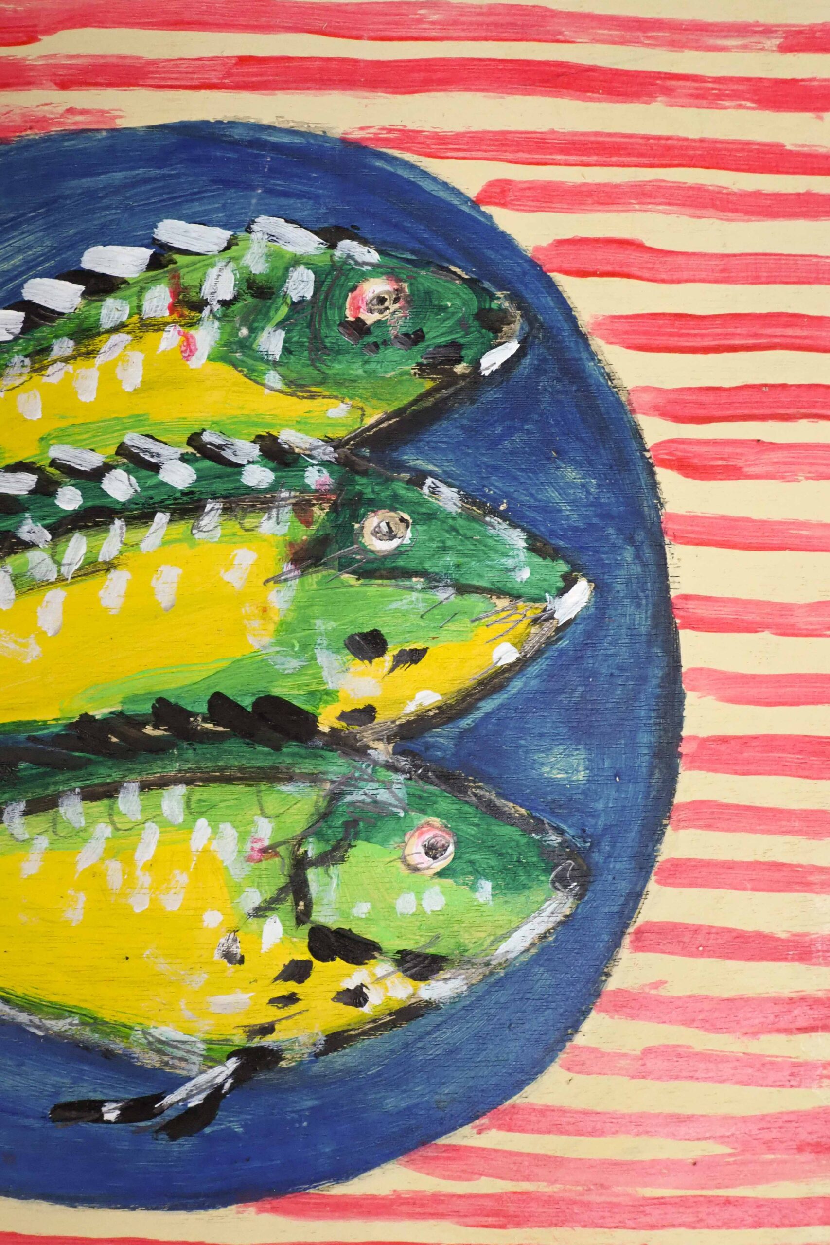A wonderful original Oil on Board Fish Painting. This painting is full of character and has a beautifully rich colour palette. Some wonderful green fish on a blue plate with a stripy cream and pink tablecloth.