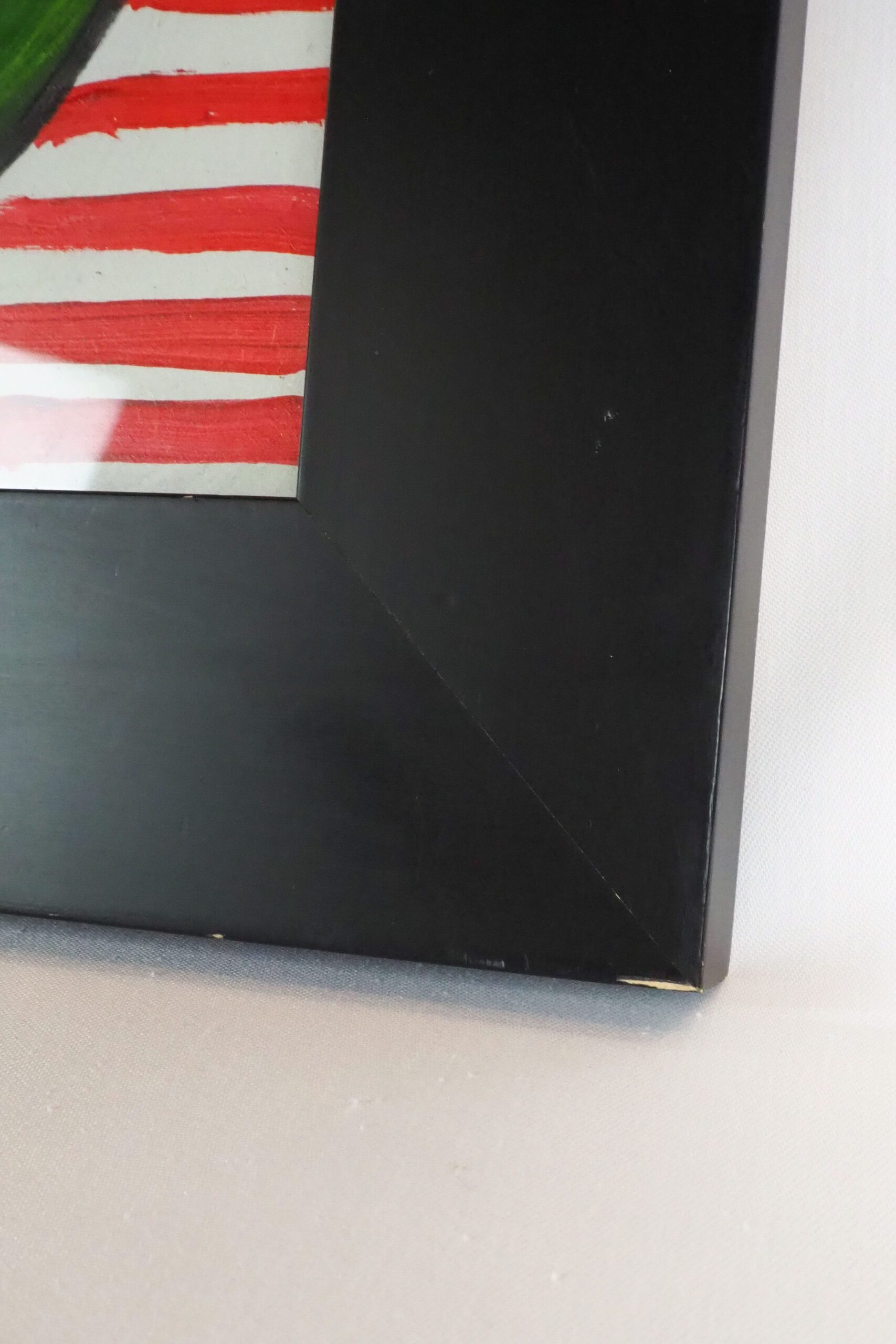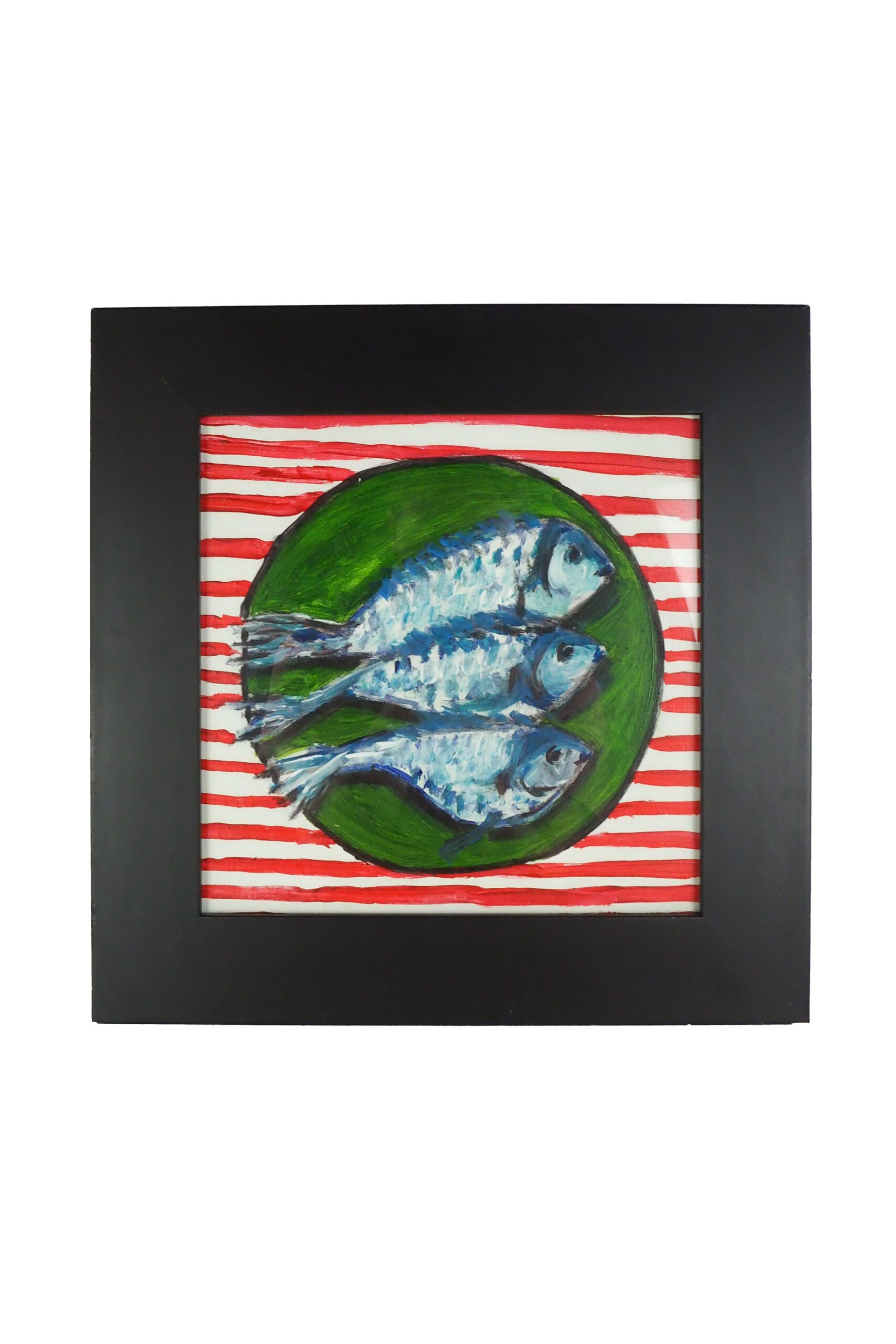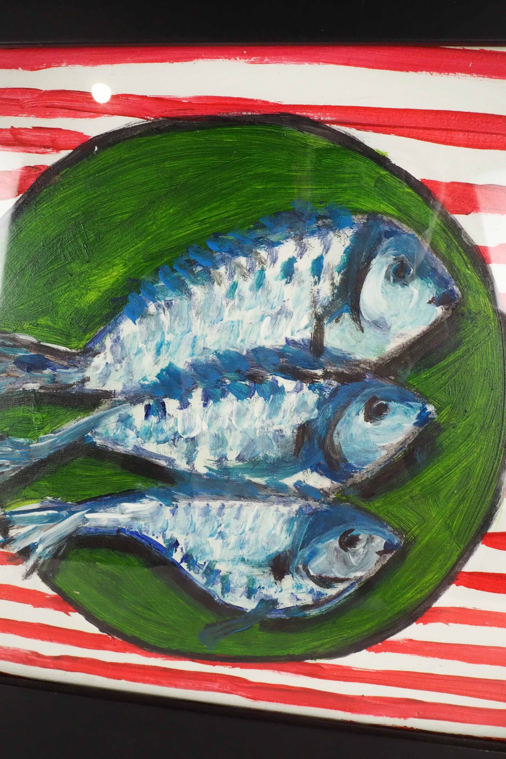 A wonderful original Oil on Board Framed Fish Painting. This painting is full of character and has a beautifully rich colour palette. Some wonderful fish on a green plate with a stripy red and and white tablecloth.