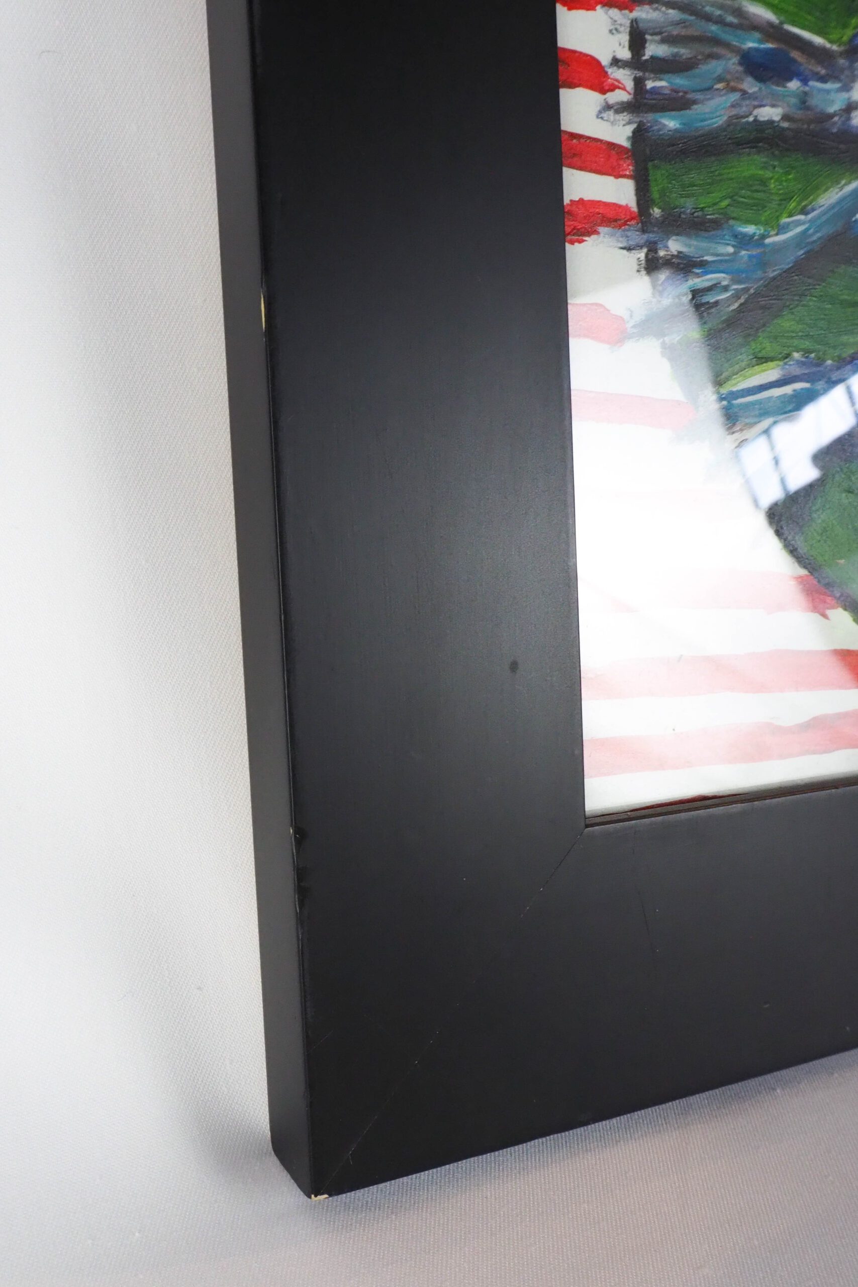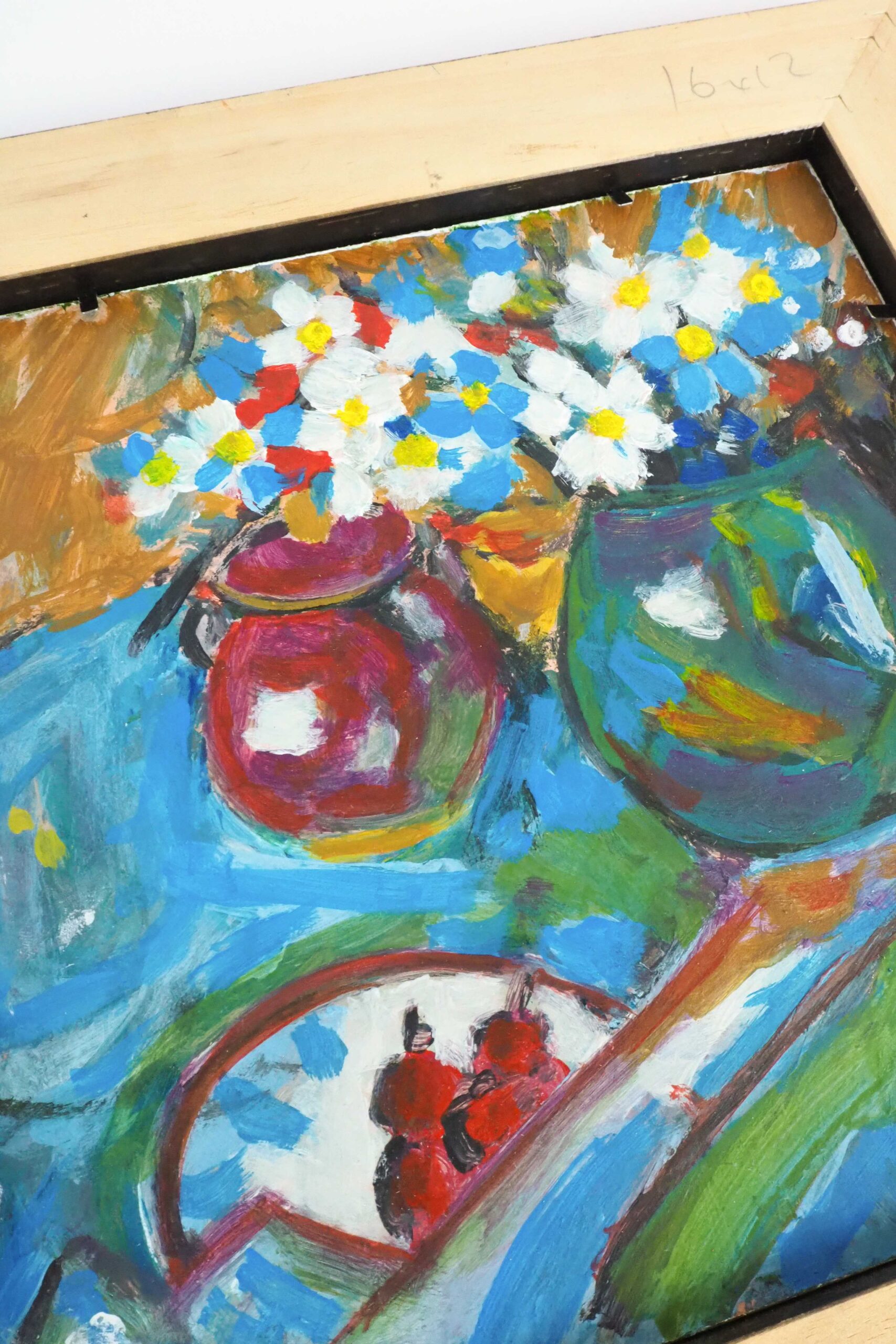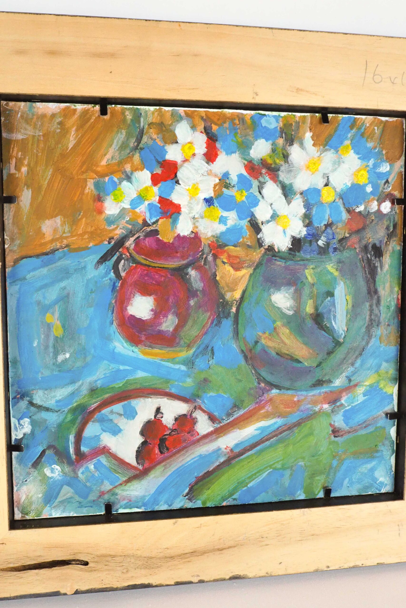 Ready to hang. Interestingly, this oil on board painting has a painting on the back of the board as well as the front. fish on one side, still life tablescape on the other. It can be framed either way or hung in an internal window so can be enjoyed from both sides.
