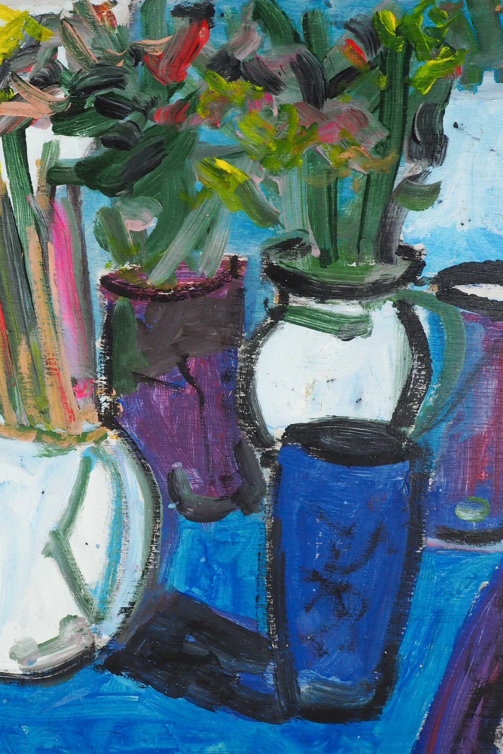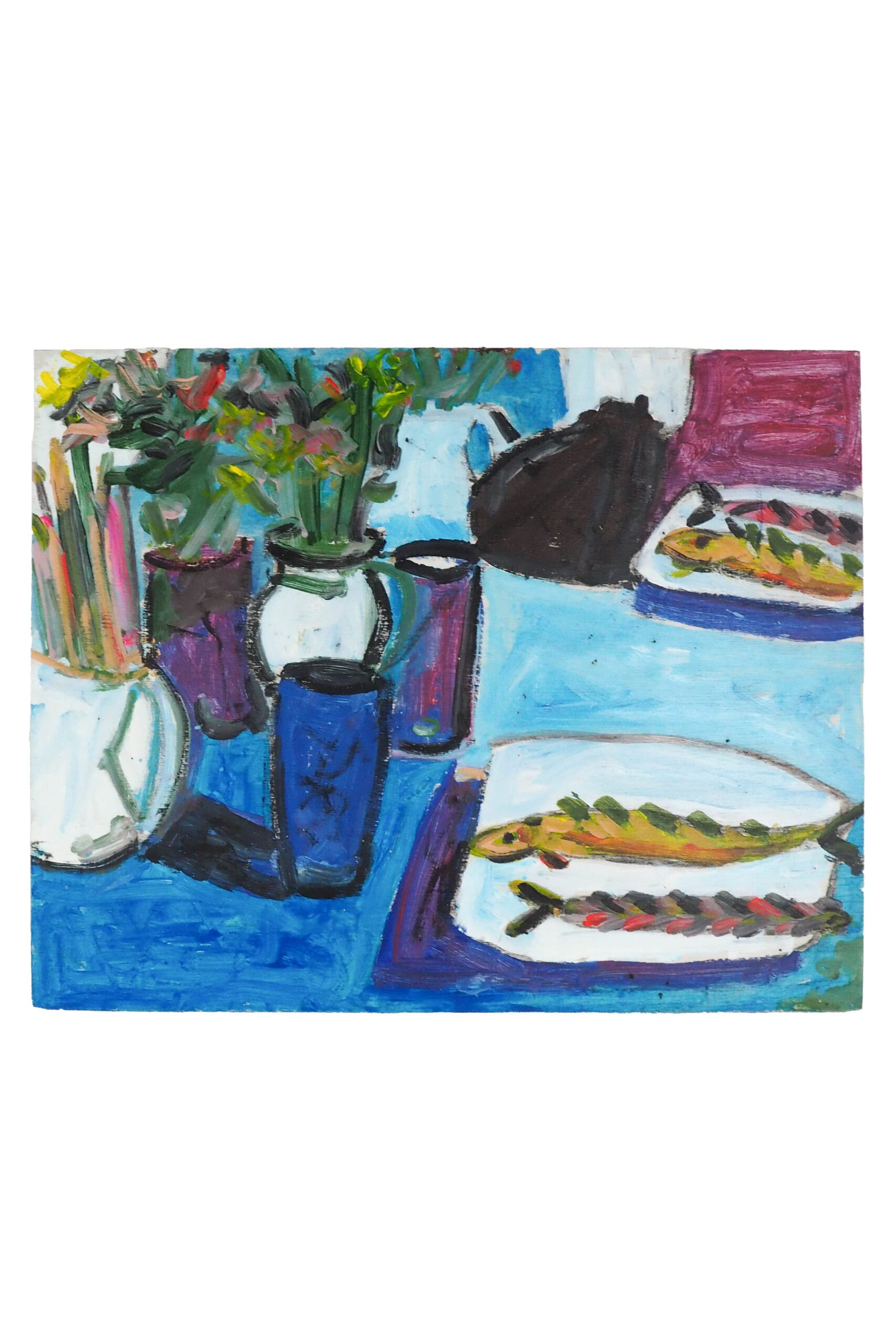 A wonderful original Oil on Board Still Life. This painting is full of character and has a beautifully rich colour palette. A rich blue tablescape still life featuring fish and vases of flowers.