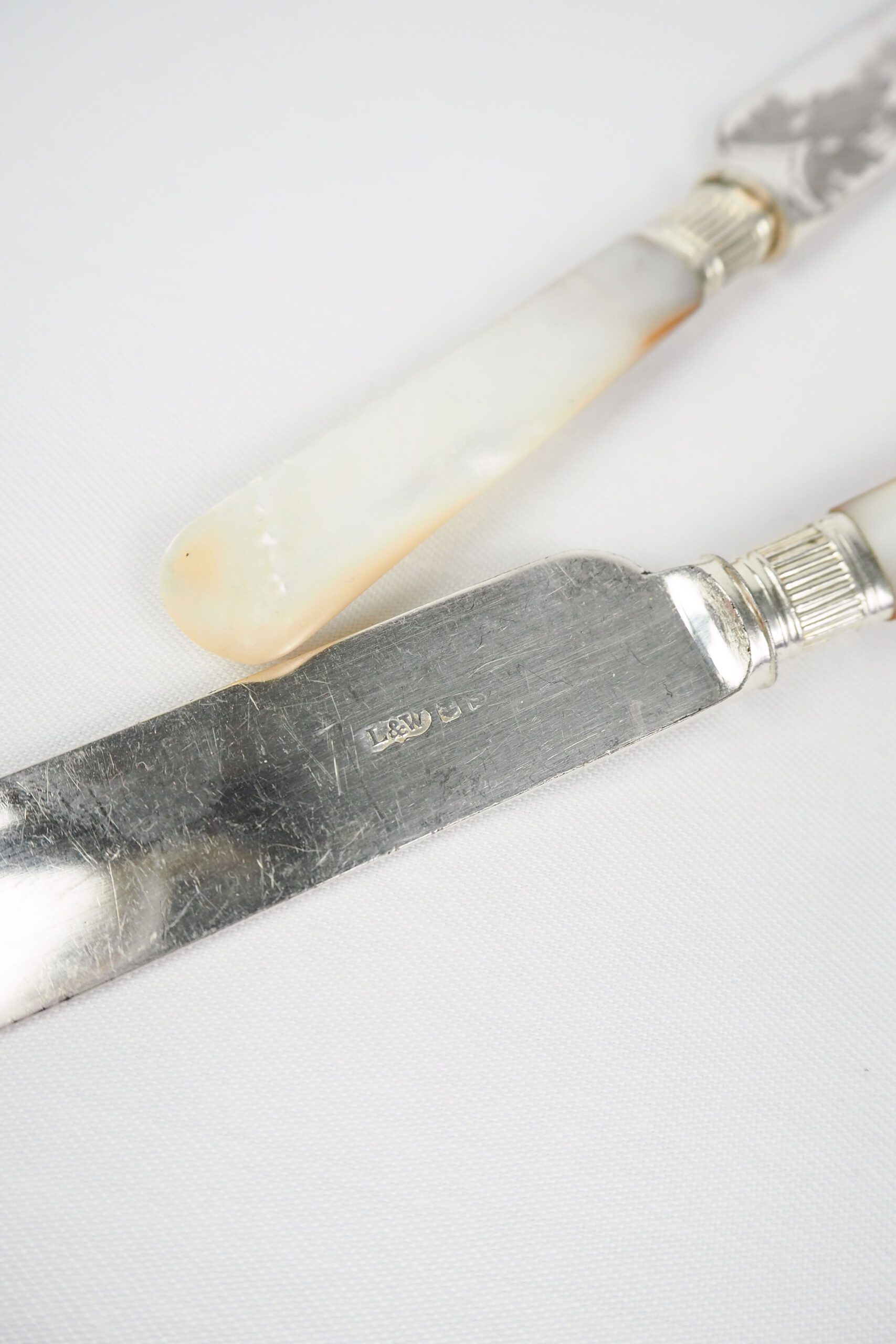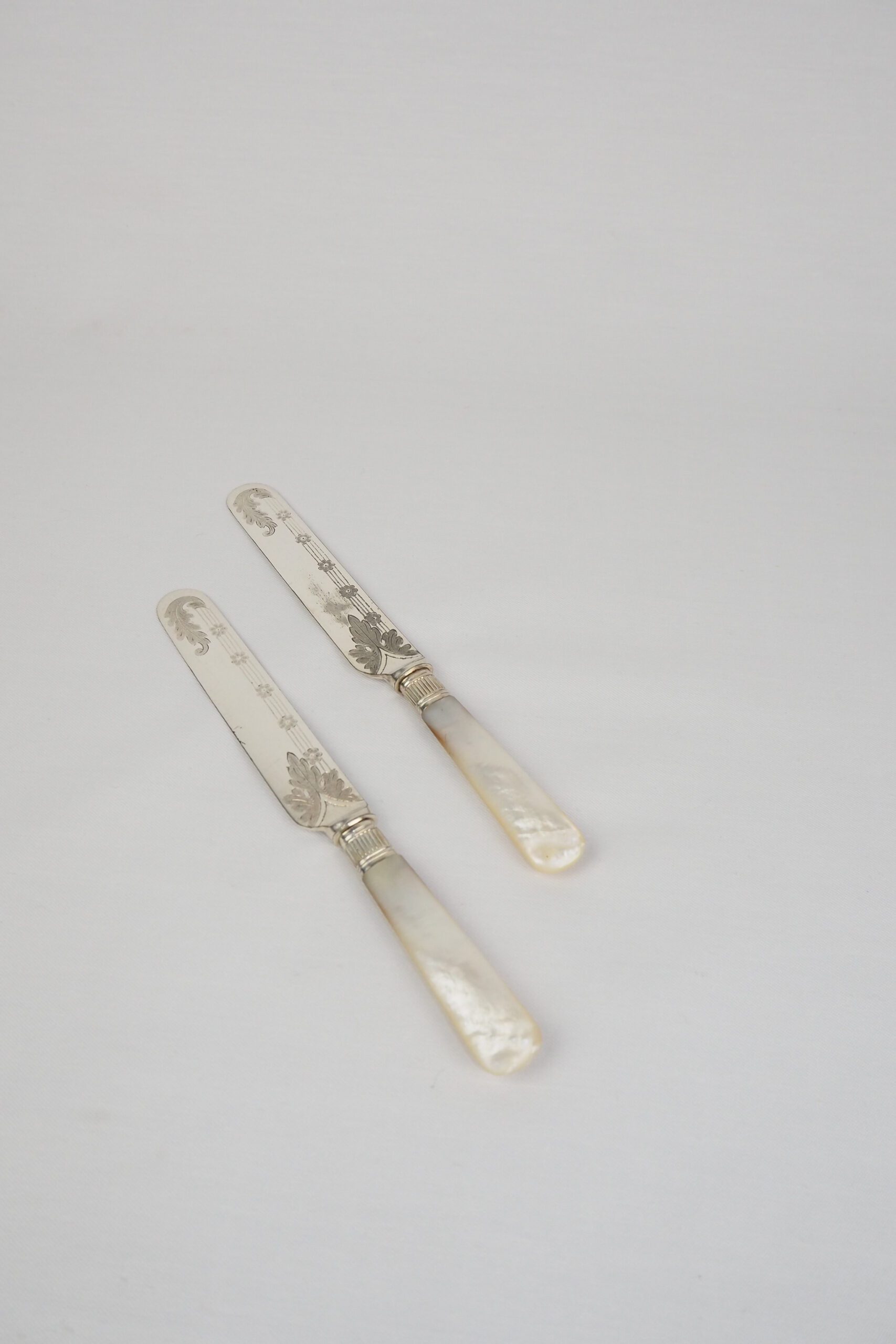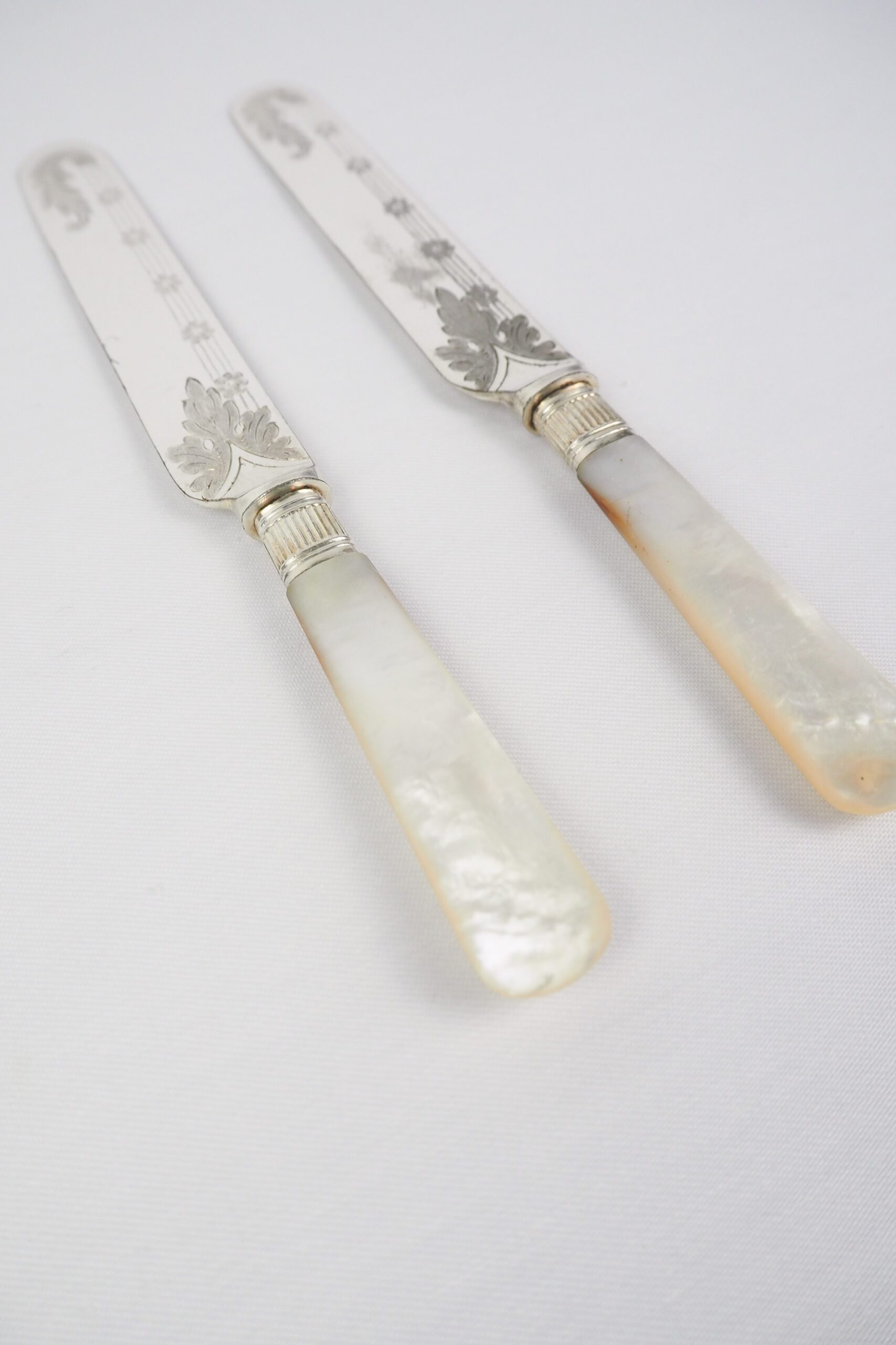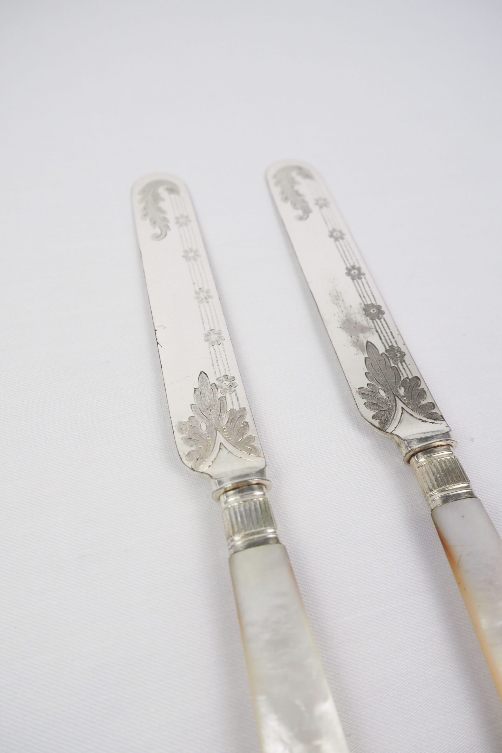 A Pair of Antique Silver Plate Knives with mother of pearl handles. The blade of each Victorian Knife has a beautifully etched floral pattern. The handles are made from a stunning piece of mother of pearl that shimmers in iridescent colours when it catches the light.