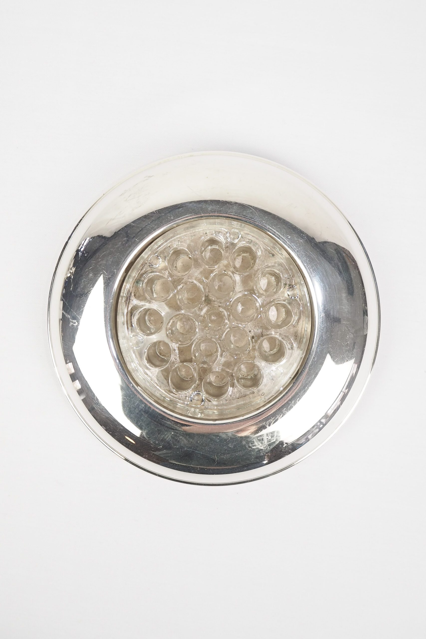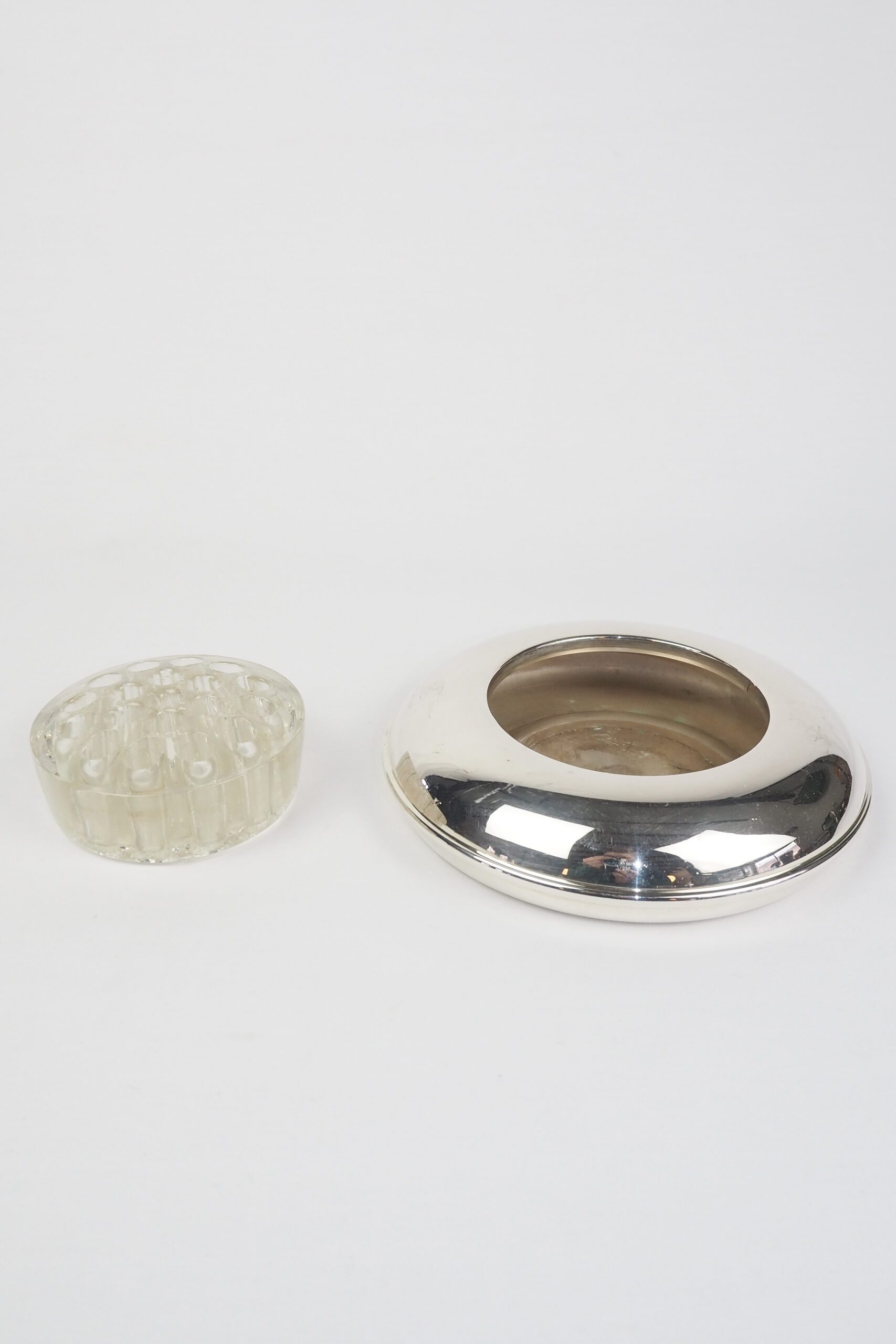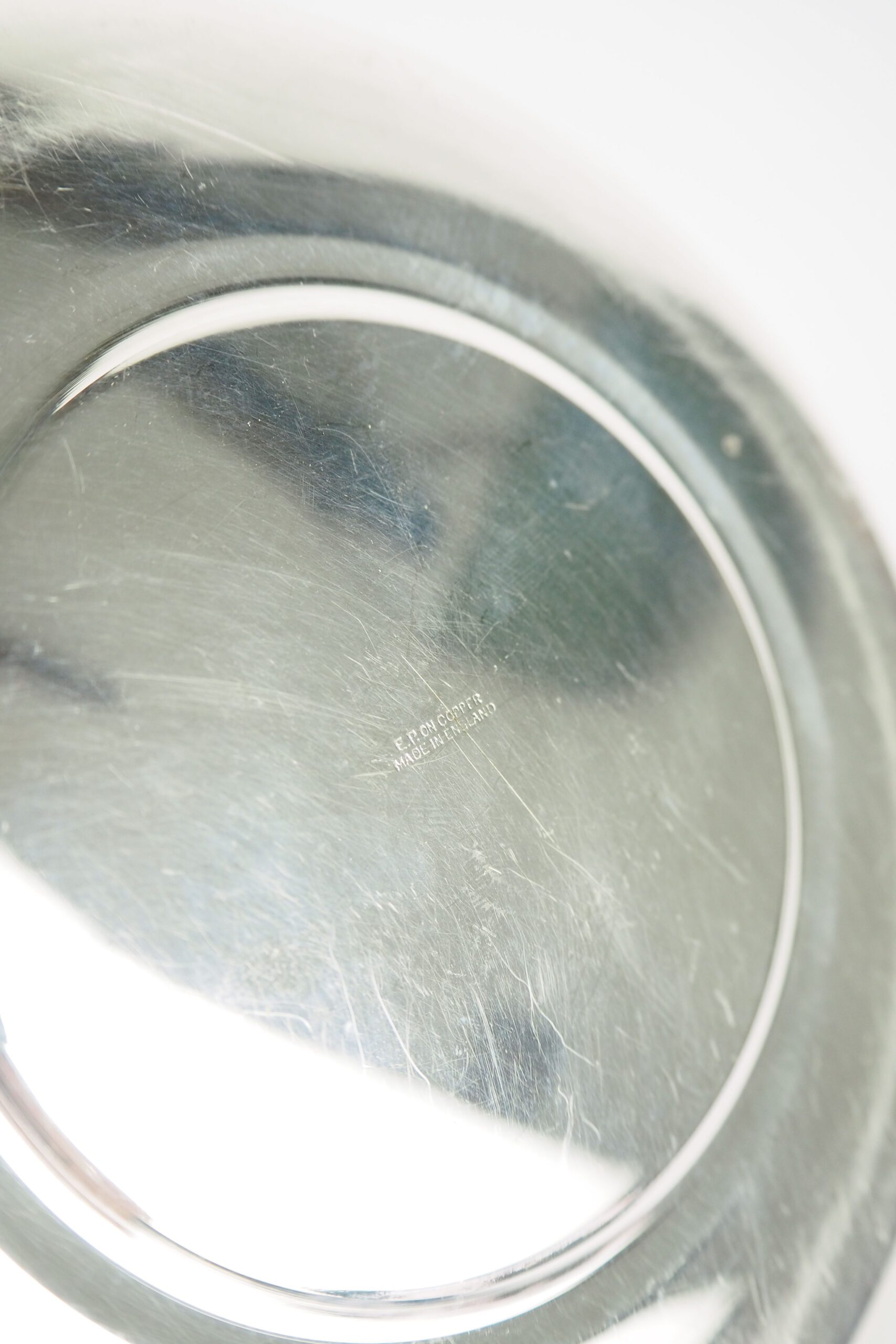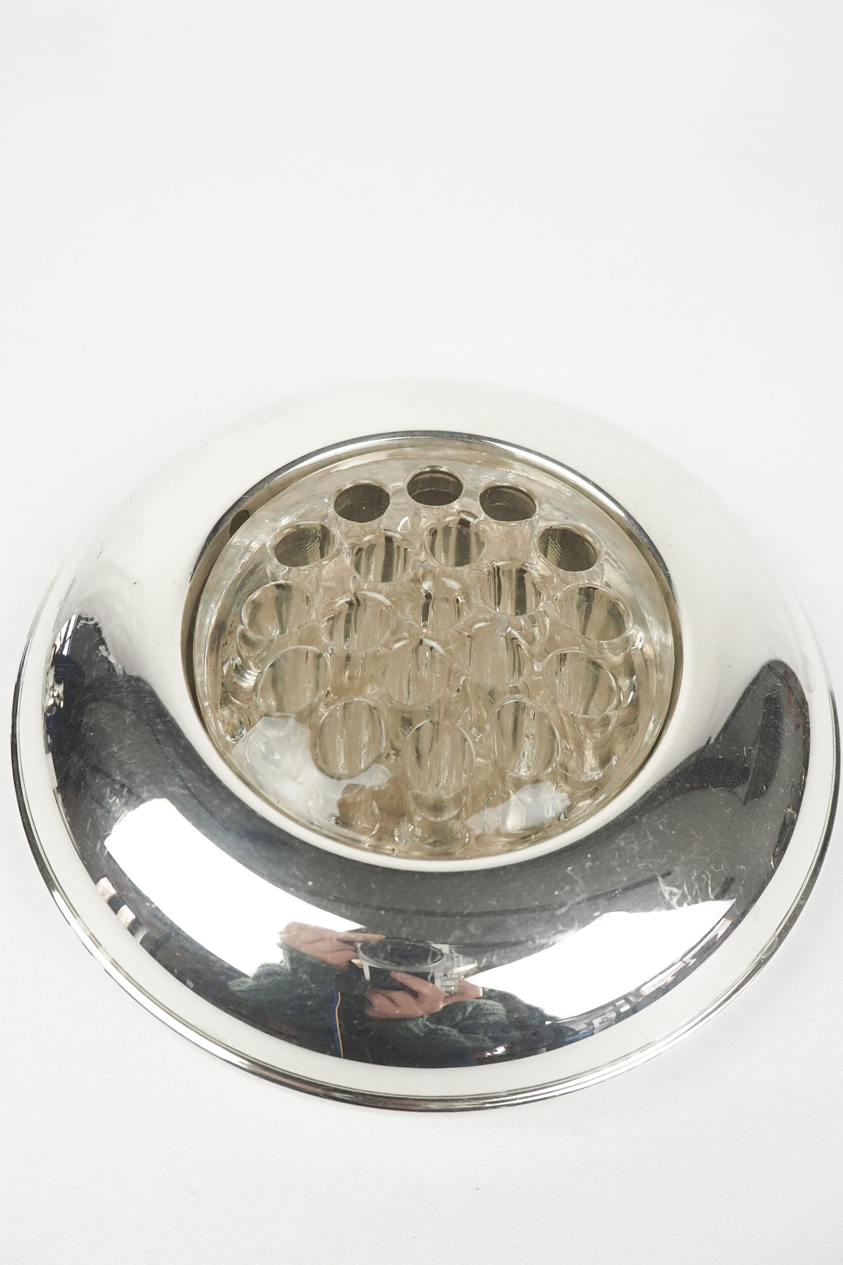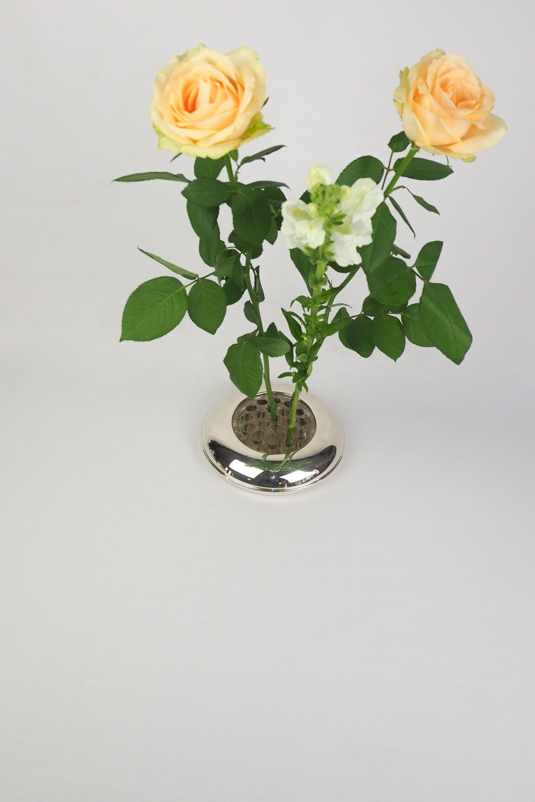 A vintage Silver Plate Flower Bowl with original glass flower frog. Filled with water, this mid century flower dish and flower frog is an elegant way to display your long stem flowers. The perfect table centrepiece or mantle décor.