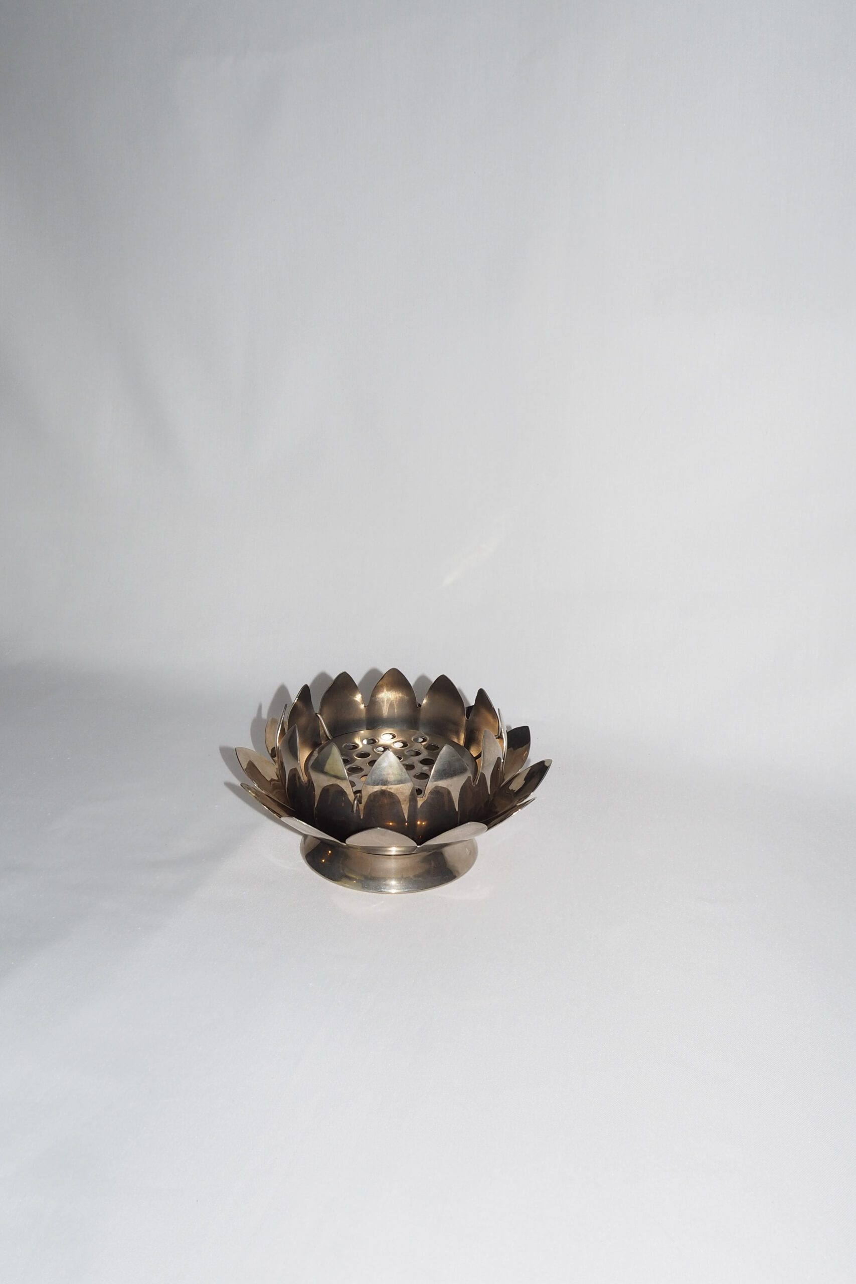 A Wonderful Silver Plate Lotus Flower Vase with a flower frog insert. This lovely vintage silver plate piece comes into three sections and looks wonderful as a table centrepiece.