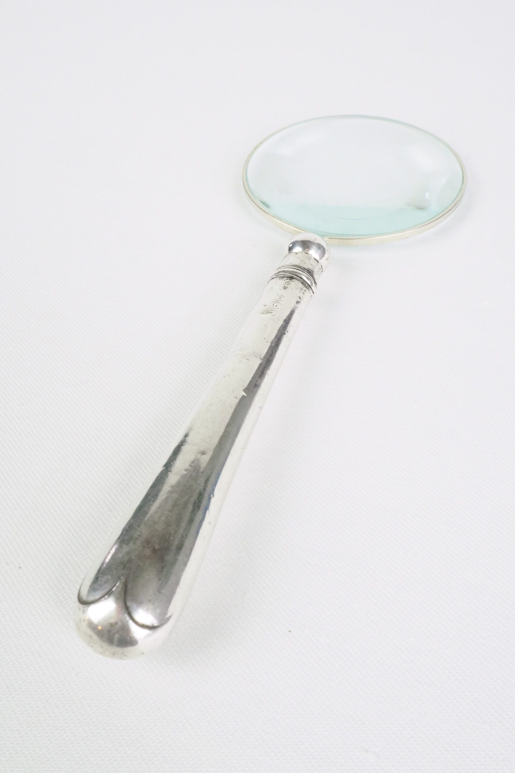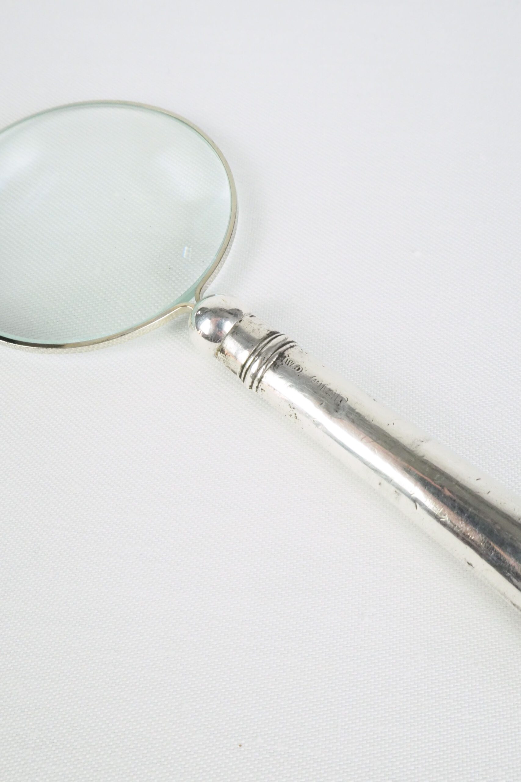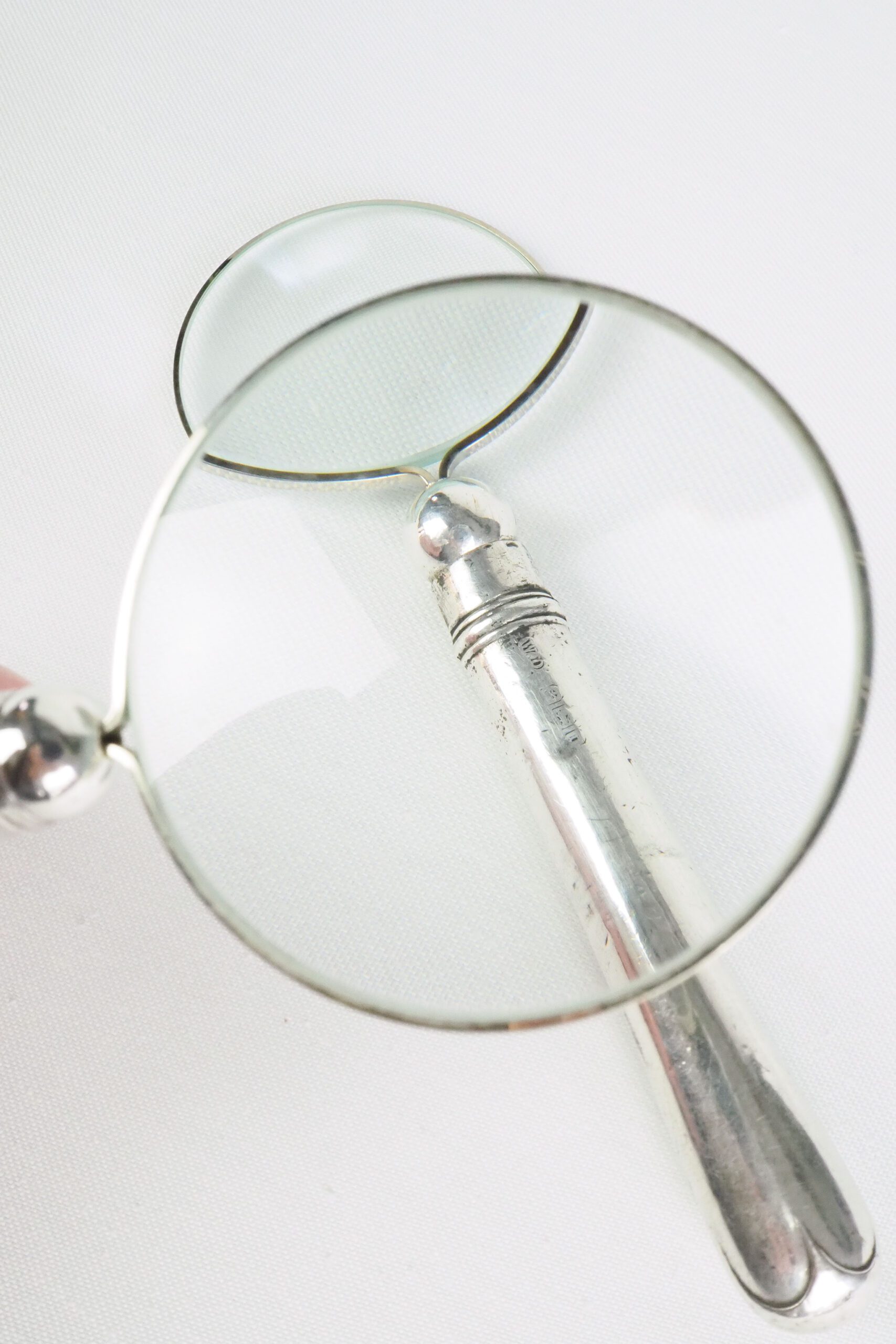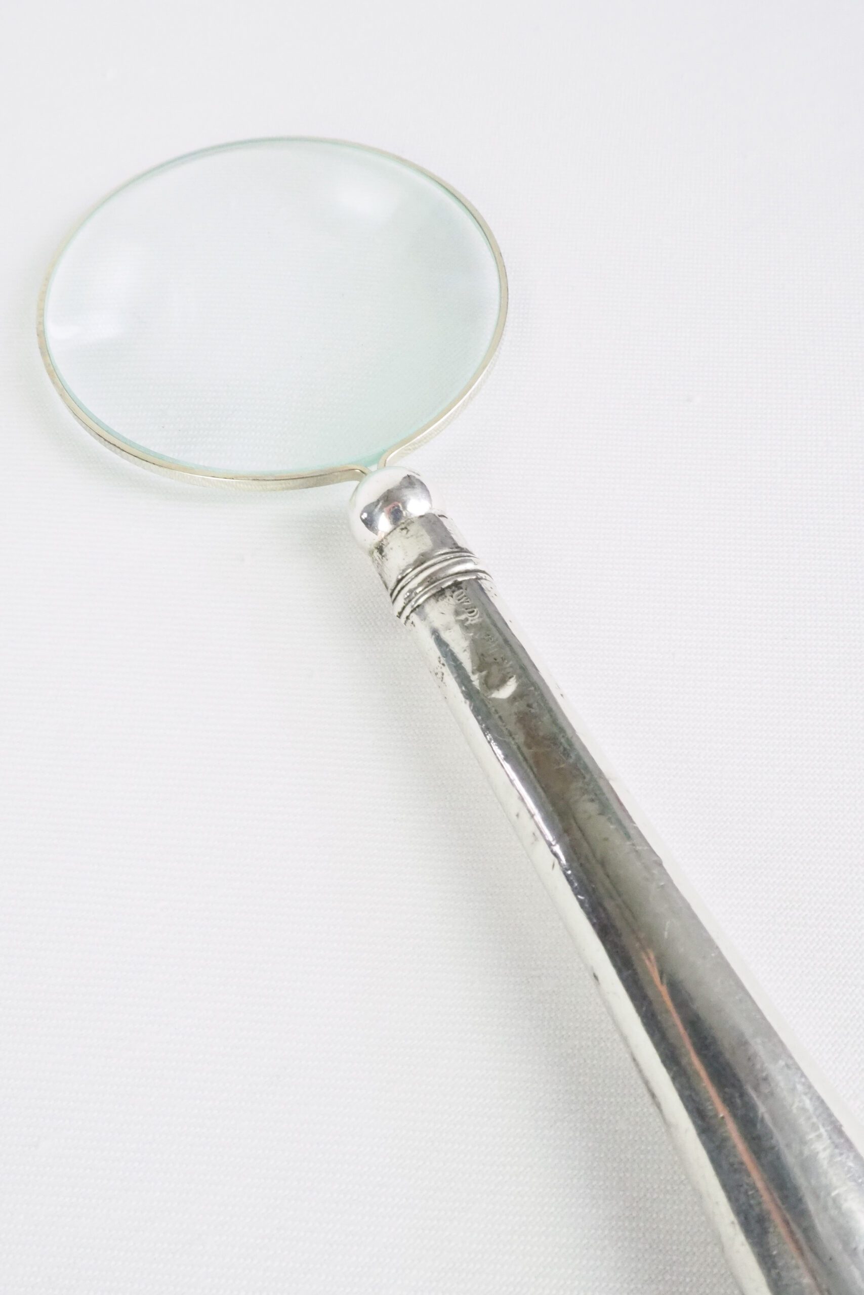 Our wonderful vintage and antique silver is sourced exclusively for Wildmore, bringing a unique selection of curated pieces to the table. Each characterful vintage piece has been preloved so please expect some tarnishing and scratches and bumps. This magnifying glass does have scratches and one small dent to the handle which brings a twinkle to the patina. It all adds to the wonderful character of this Antique Sterling Silver Magnifying Glass.