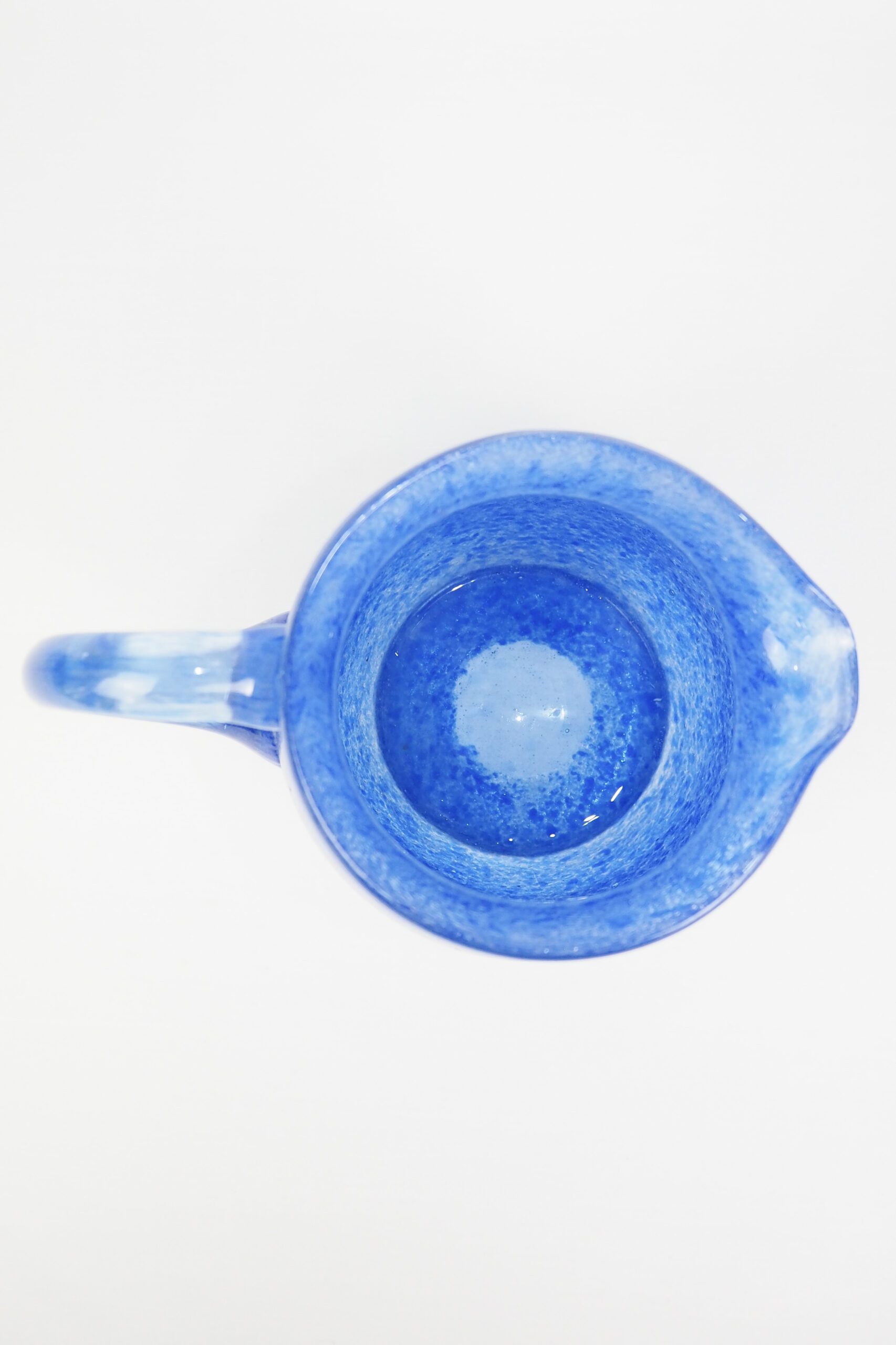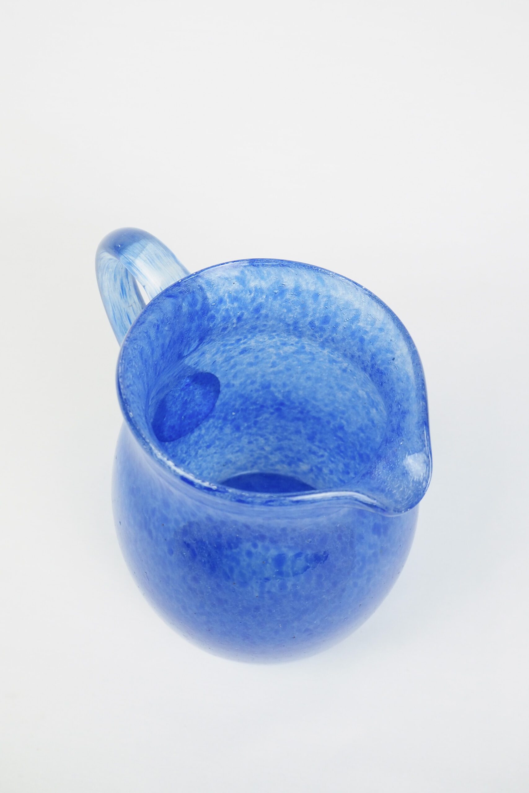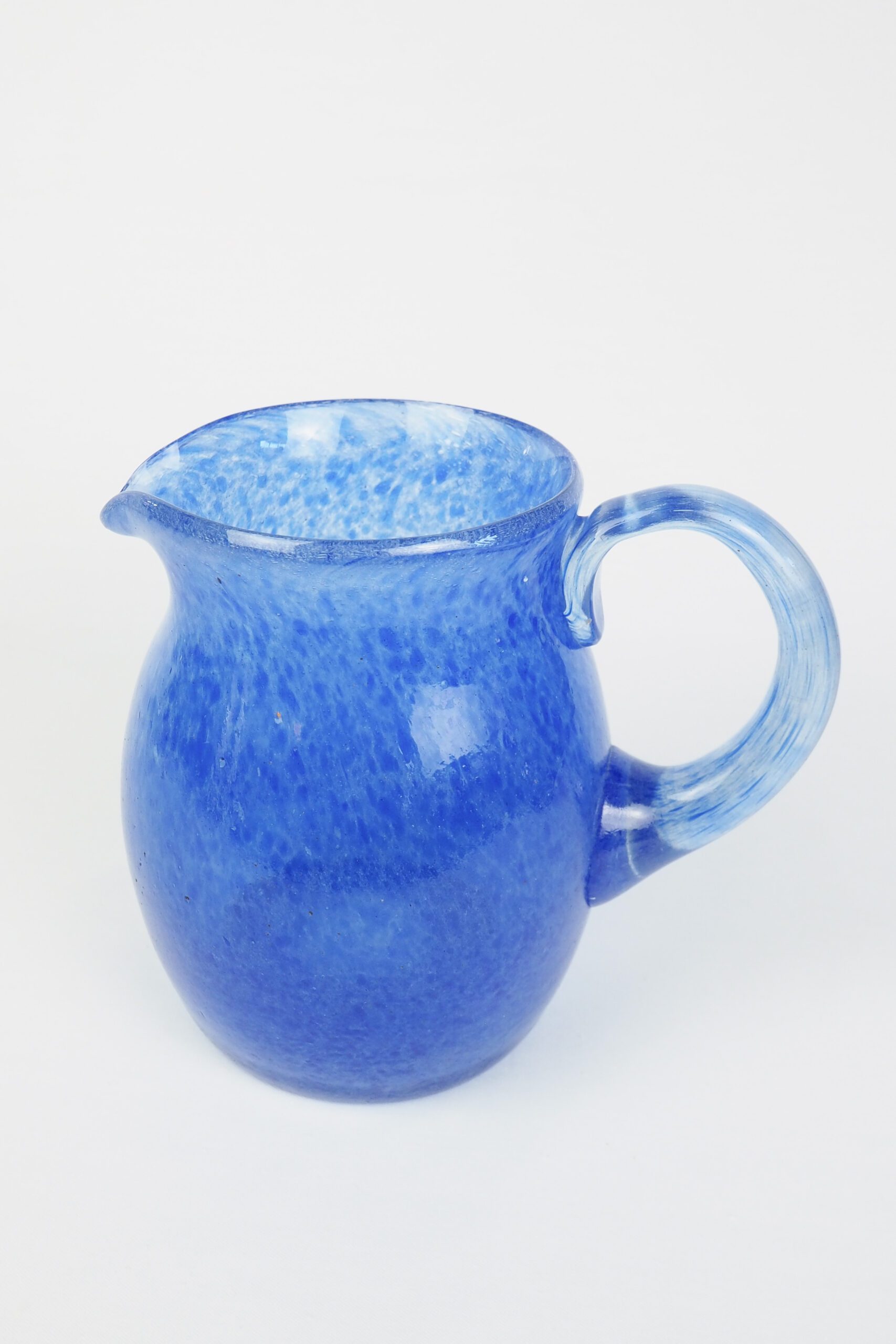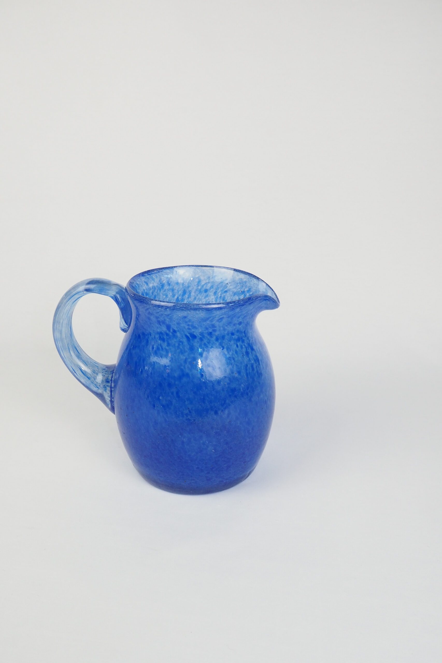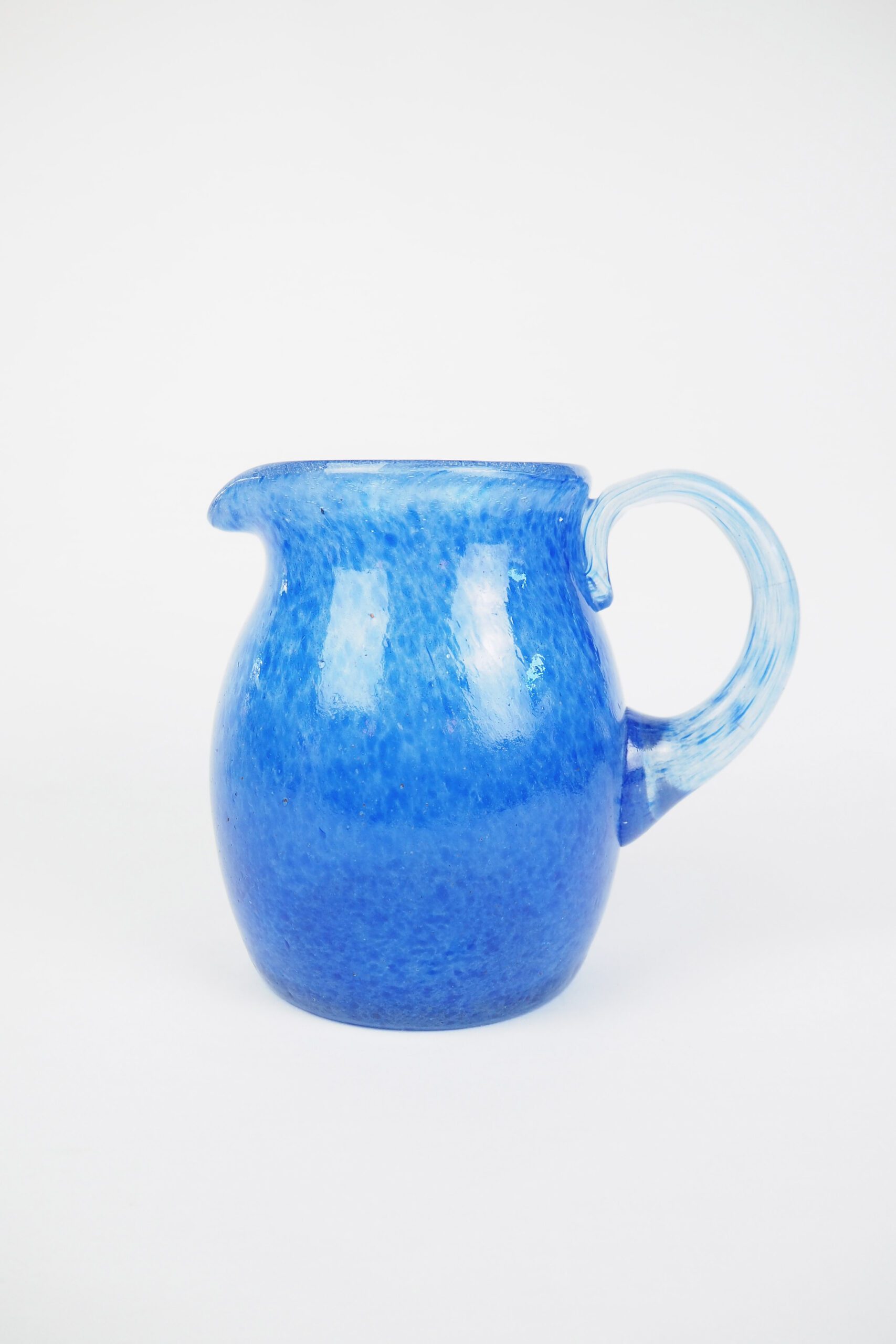 A hand blown Vintage Glass Jug with a blue speckle pattern and bubbles running through the glass. This unique water jug is a beautiful rich azure blue tortoise shell pattern. Its hand blown nature has given the glass beautiful bubbles. This Jug is in superb vintage condition with no flaws.