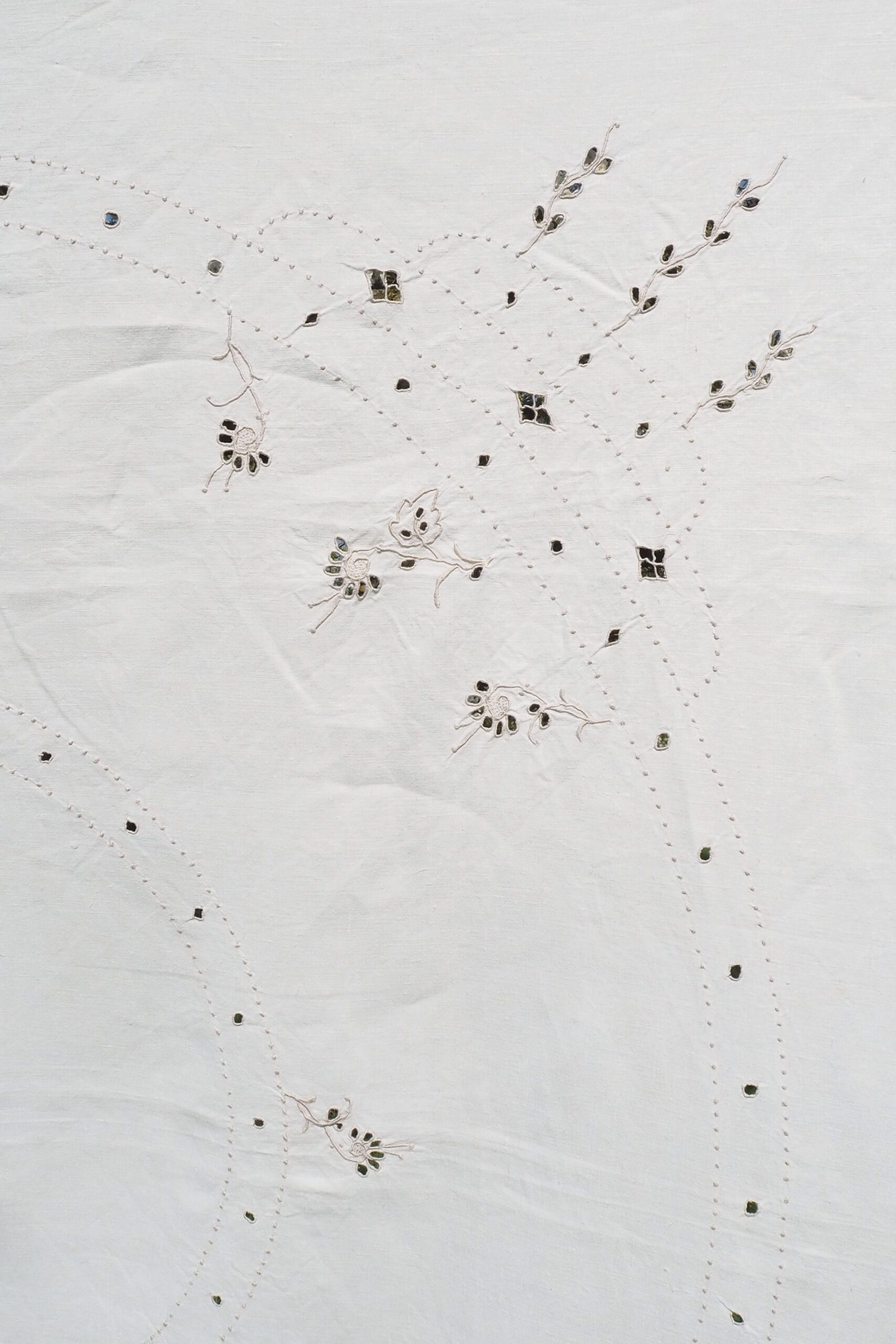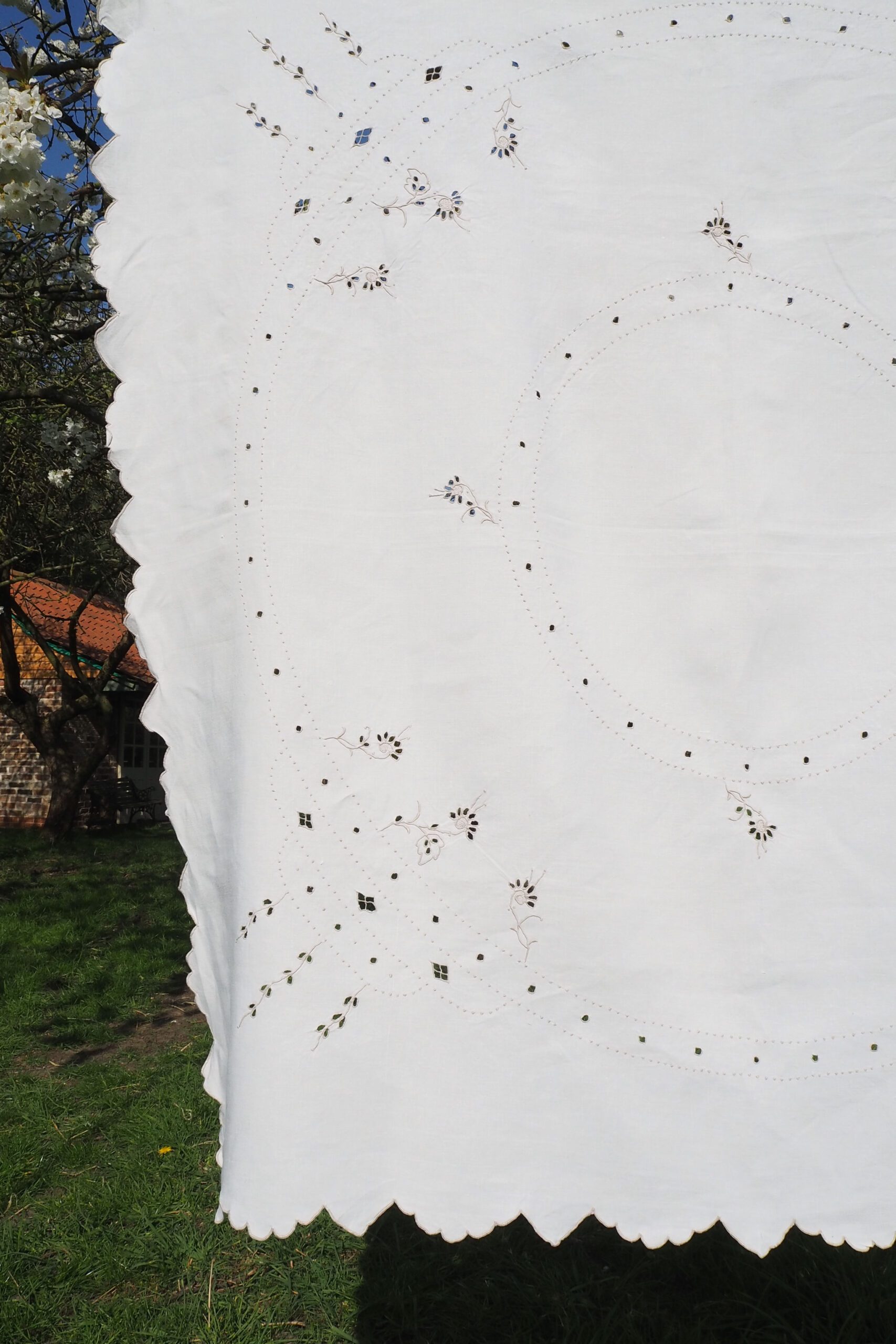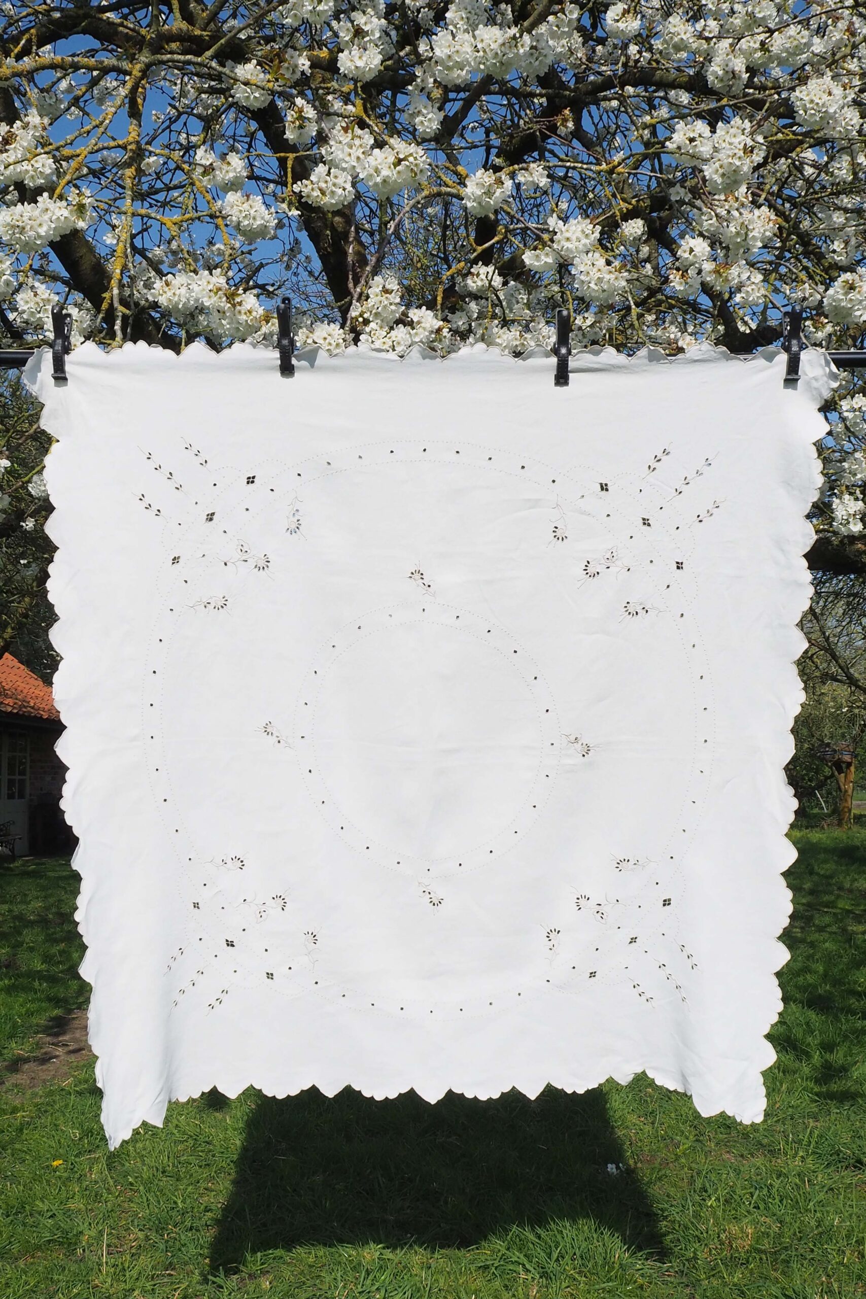 This Vintage Linen Broderie Anglaise Tablecloth will give your tablescape a beautiful classic aesthetic. A wonderful antique off white tablecloth decorated with scrolling floral broderie anglaise and embroidery in a mushroom colour. Each of our vintage and antique linens is unique, perfect for hosting a memorable diner party.