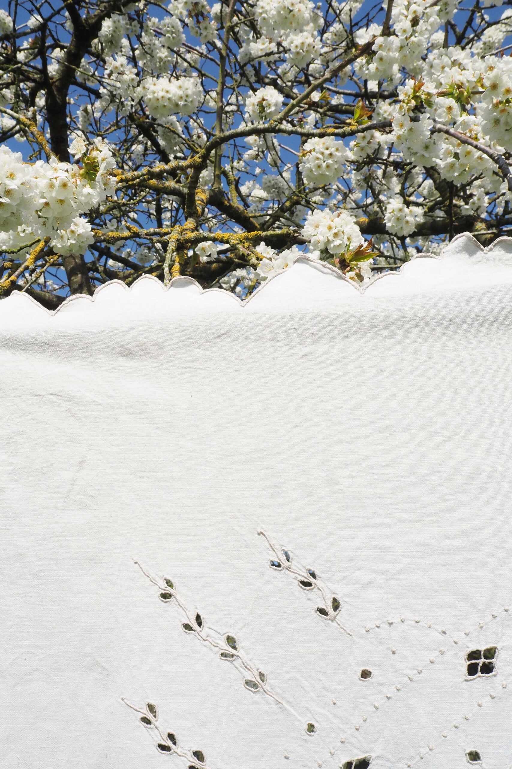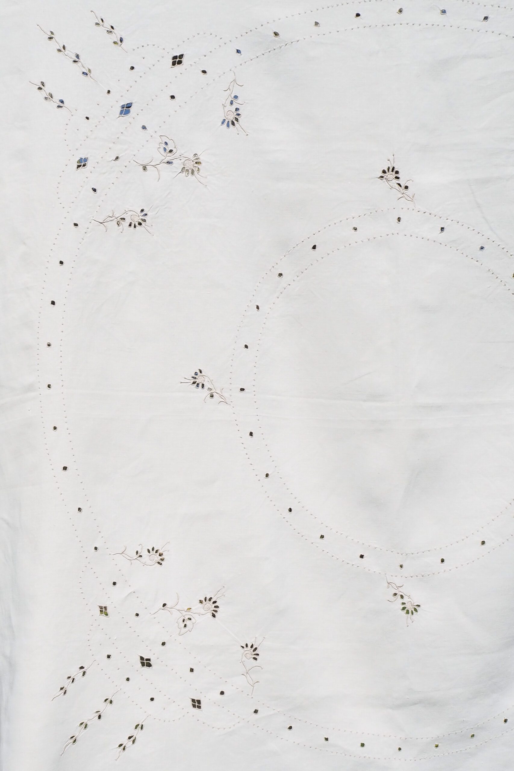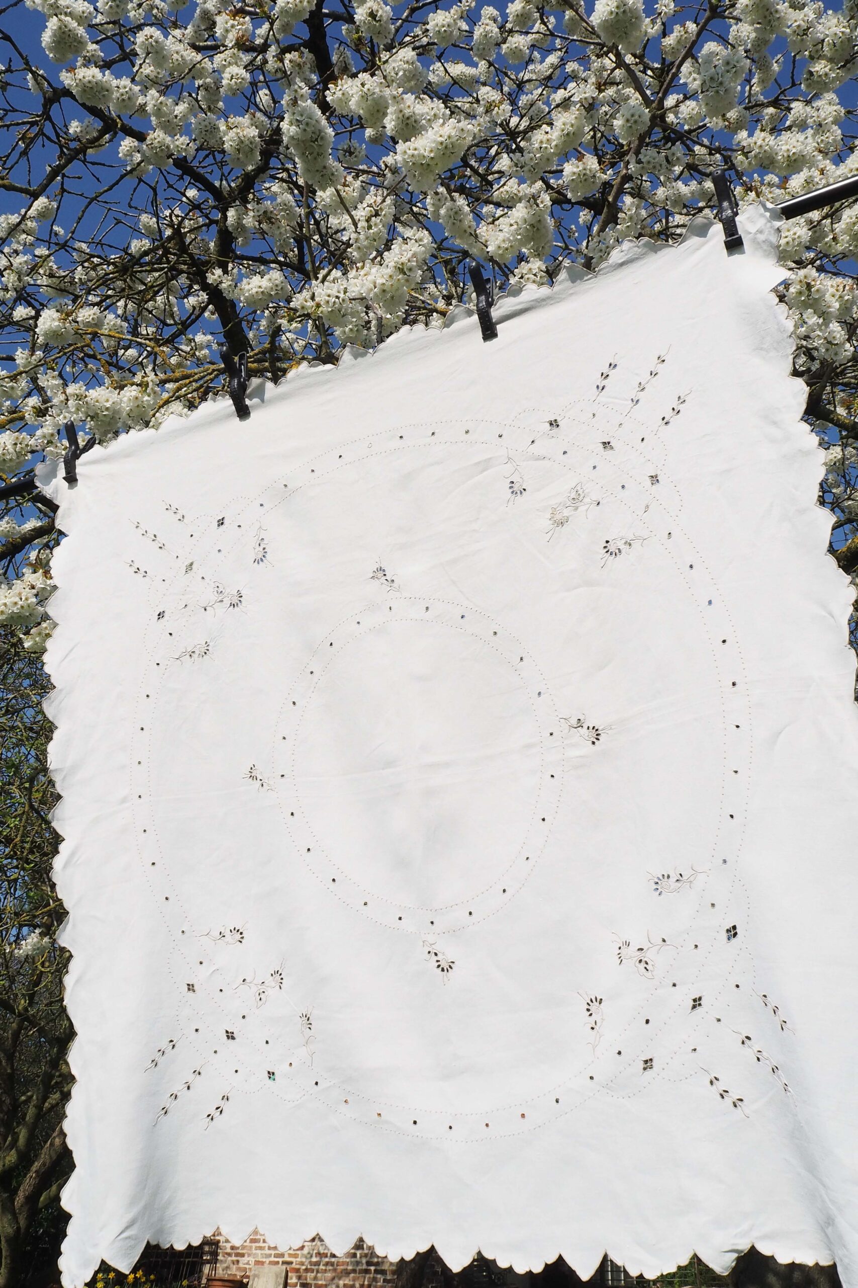This Vintage Linen Broderie Anglaise Tablecloth will give your tablescape a beautiful classic aesthetic. A wonderful antique off white tablecloth decorated with scrolling floral broderie anglaise and embroidery in a mushroom colour. Each of our vintage and antique linens is unique, perfect for hosting a memorable diner party.
