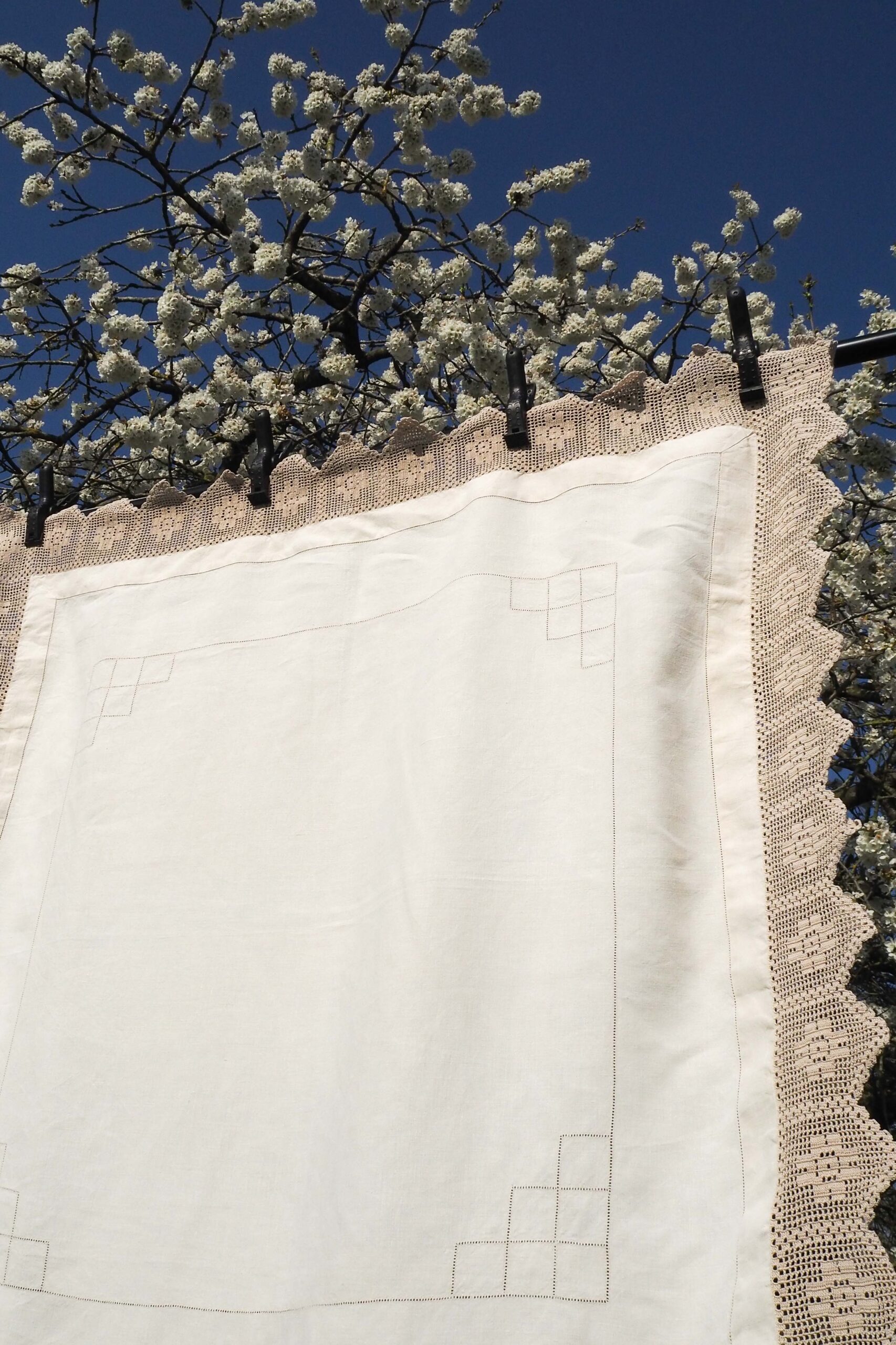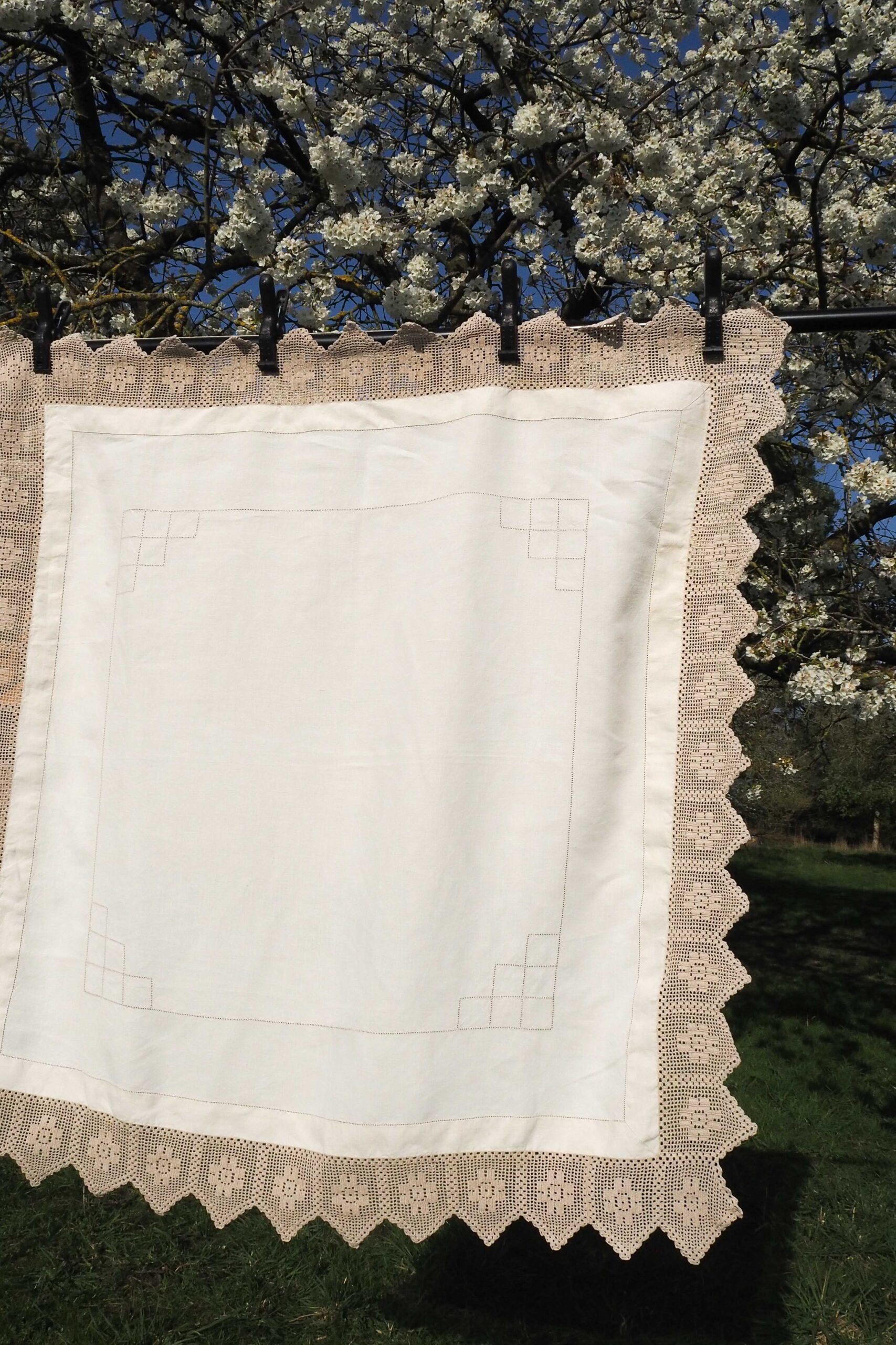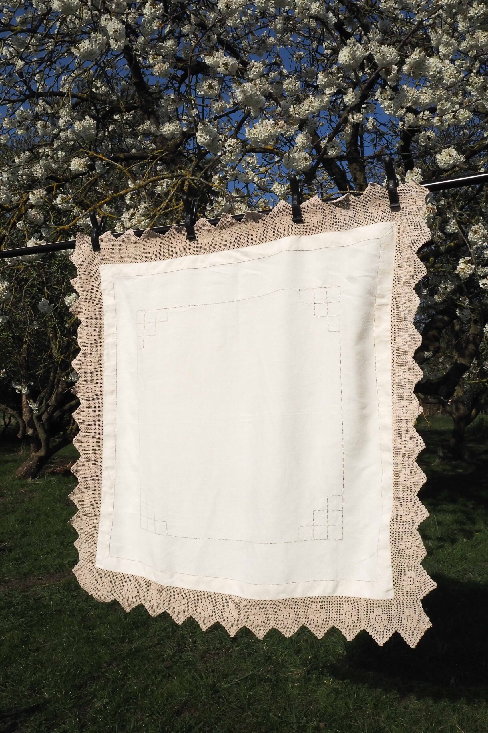 This square Vintage Linen Tablecloth with a crochet edge will give your tablescape a beautiful classic aesthetic. Off white linen decorated with a mushroom coloured lacework.. Each of our vintage and antique linens is unique, perfect for hosting a memorable diner party.