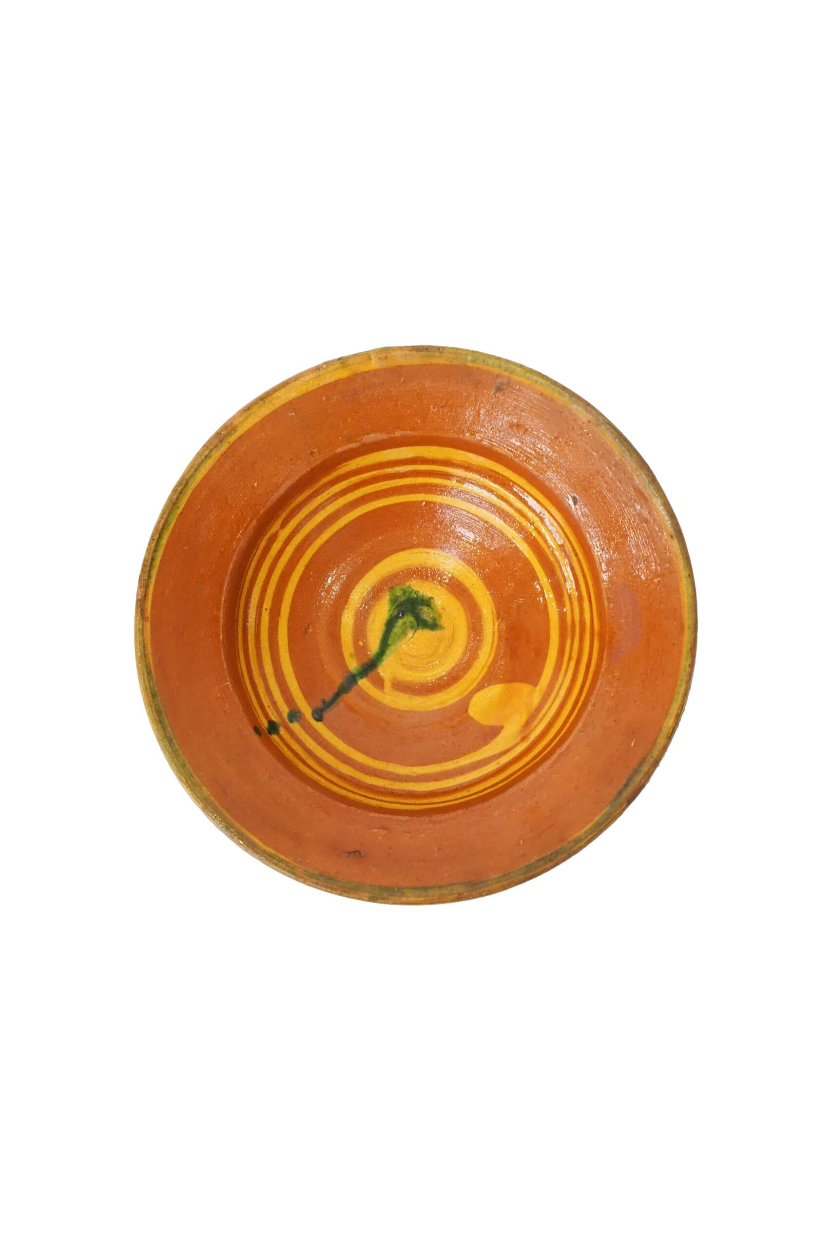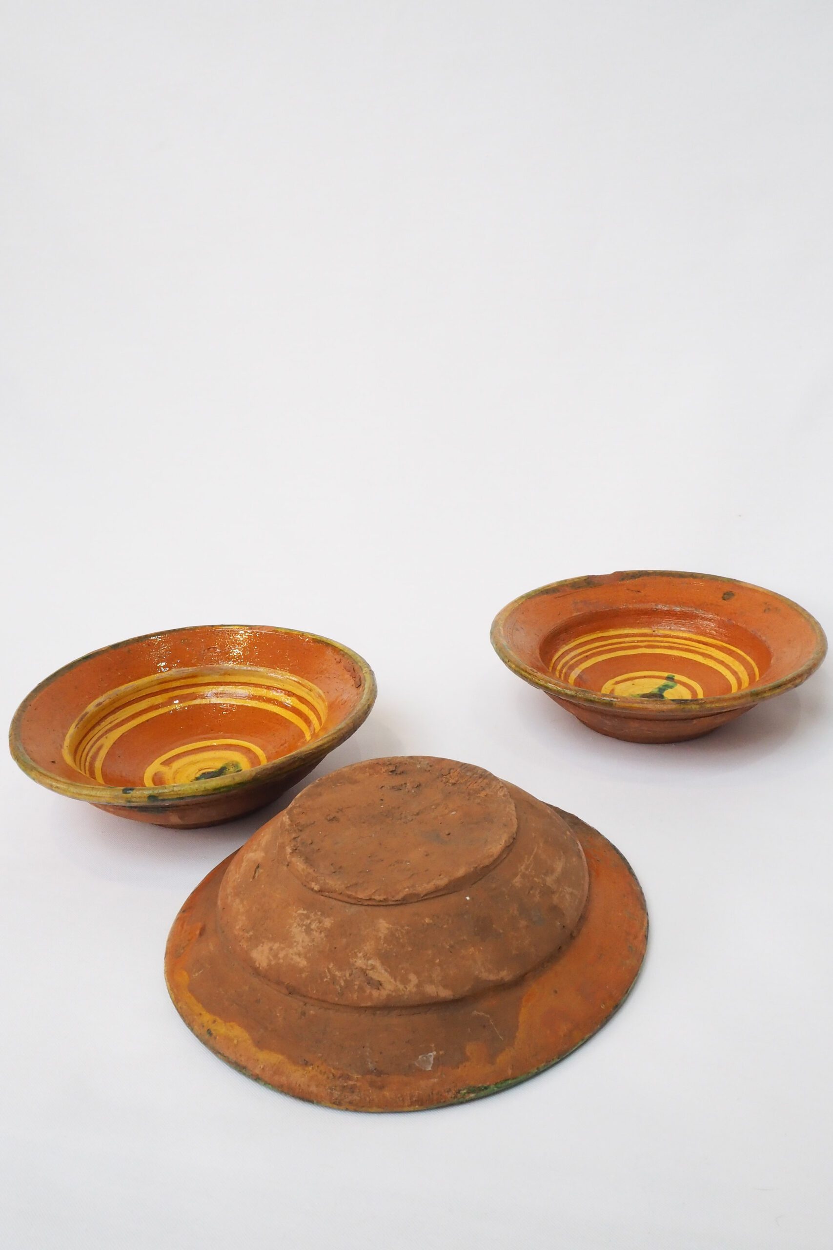 As with anything vintage, this piece may have a few bumps and scrapes but it all adds to the character. Colours and patterns will vary between each piece so please expect your bowl to be beautifully unique. This hand made pieces of folk art has blotches of green and swirls of yellow on the terracotta the glaze. There are some old chips to the dishes that add character and tell the story of their previous life. See images. Priced per dish.