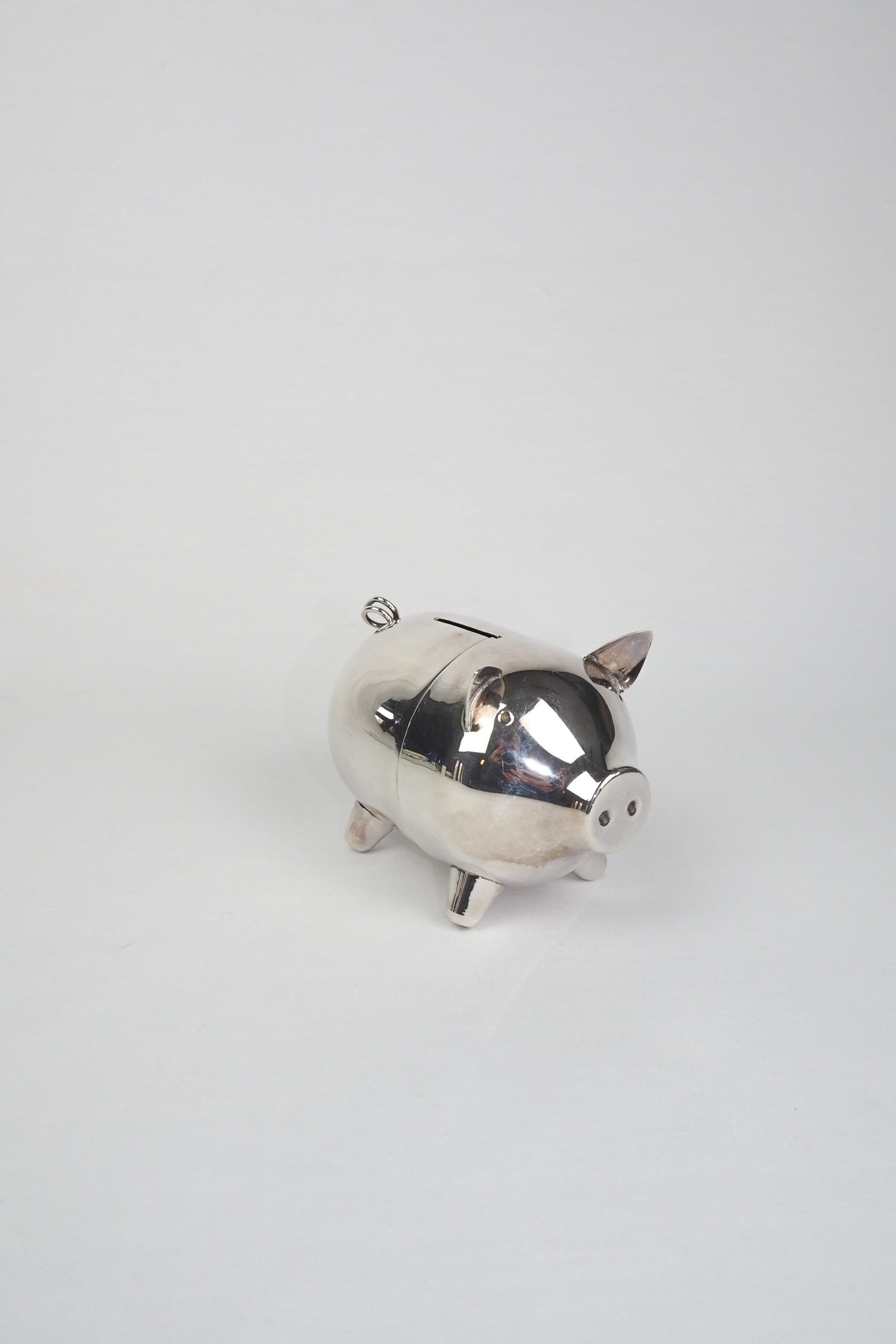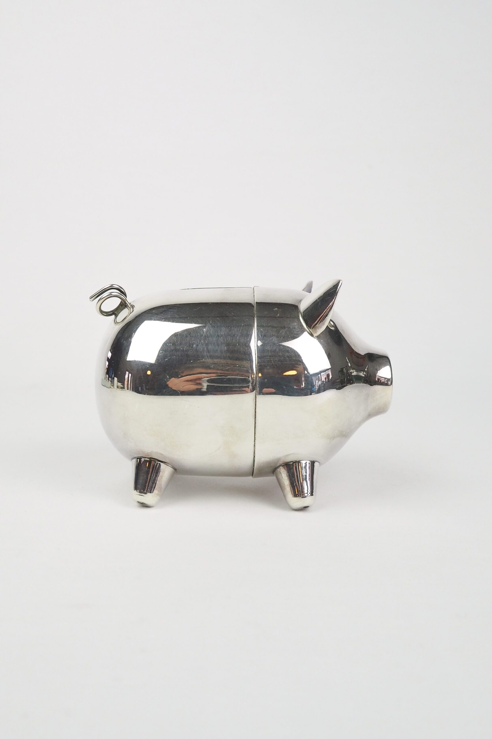 A wonderful Vintage Silver Plate Piggy Bank. This silver plated pig money box has a little curly tail and expressive ears. This vintage piece has a fabulous look and is perfect for saving up your coins for a special treat. The two halves simply unclick to get to your treasure.