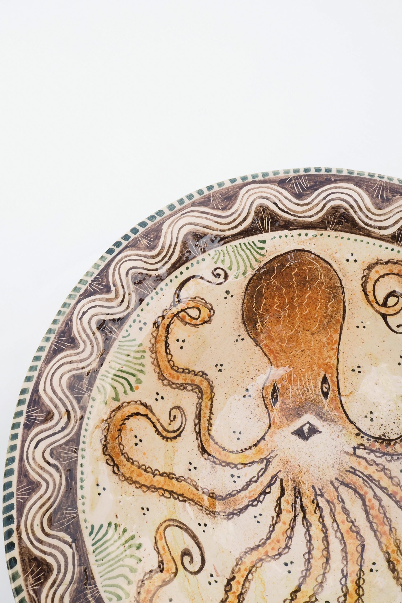 Part of our new collaboration with potter Shaun Clark, this XLarge Octopus Serving Dish features a charming sea creature and an intricately hand painted pattern. This exquisite Charger Bowl by Shaun Clark has been exclusively hand thrown and decorated for Wildmore. Shaun hand crafts each piece in his Nottinghamshire garden studio. He intricately decorates each piece with slip on both the top and bottom, creating an exceptional piece of pottery that can be treasured and enjoyed for generations.