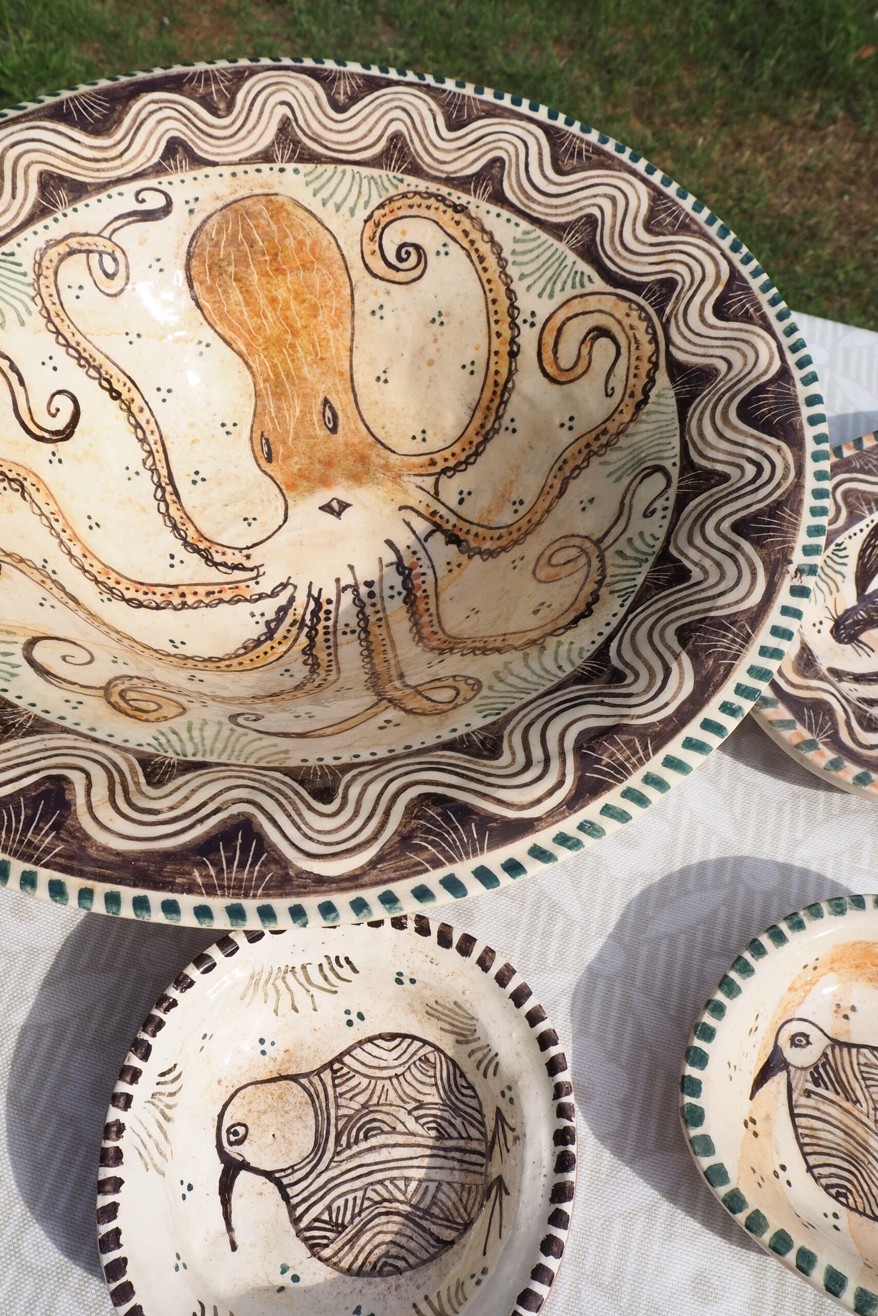 Part of our new collaboration with potter Shaun Clark, this XLarge Octopus Serving Dish features a charming sea creature and an intricately hand painted pattern. This exquisite Charger Bowl by Shaun Clark has been exclusively hand thrown and decorated for Wildmore. Shaun hand crafts each piece in his Nottinghamshire garden studio. He intricately decorates each piece with slip on both the top and bottom, creating an exceptional piece of pottery that can be treasured and enjoyed for generations.